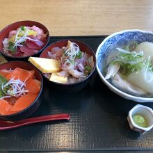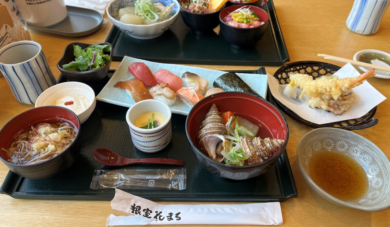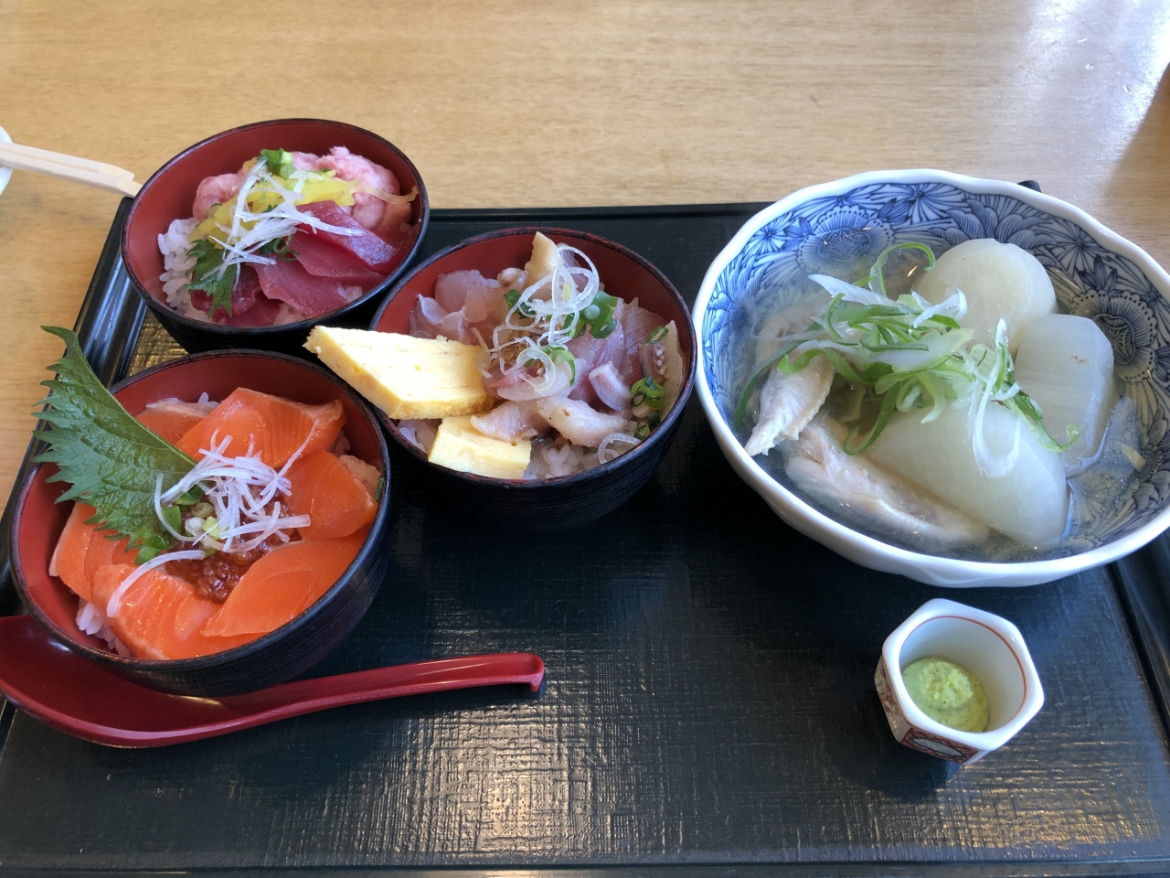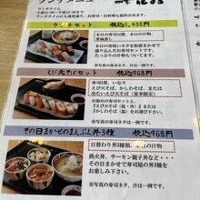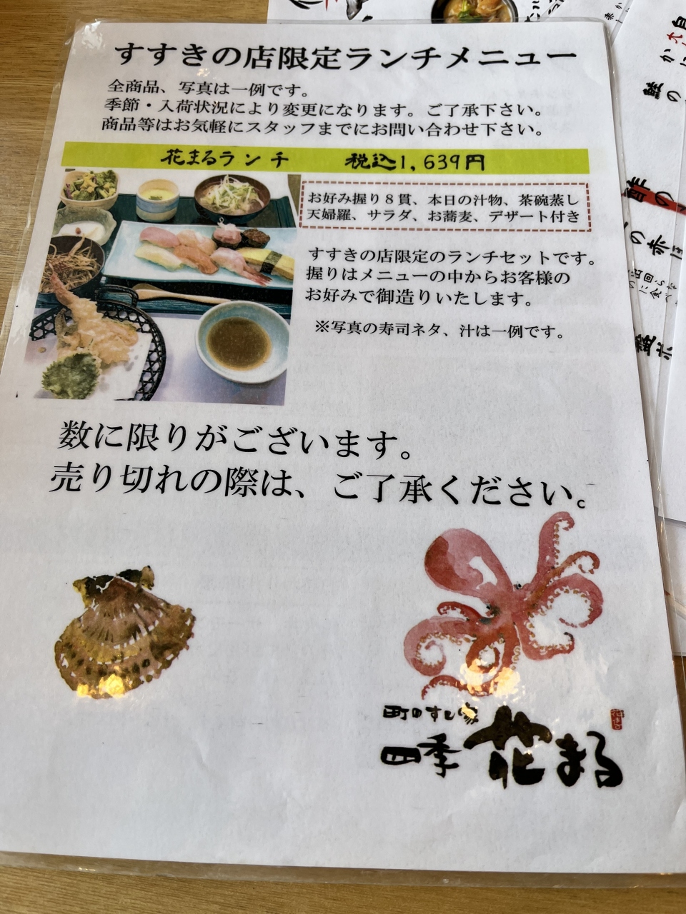根室花まるの系列店です。平日のランチで利用しました。ランチメニューから、その日まかせのまんぷく丼3種(968円)と花まるランチ(1,639円)を注文しました。花まるランチは、すすきの店限定メニューで、お好みの握り8貫に天婦羅や蕎麦もセットになったお得なメニューです。まんぷく丼3種も、丼が3種も食べられて大満足の内容でした。