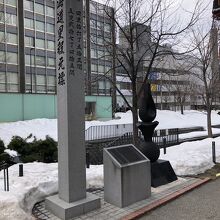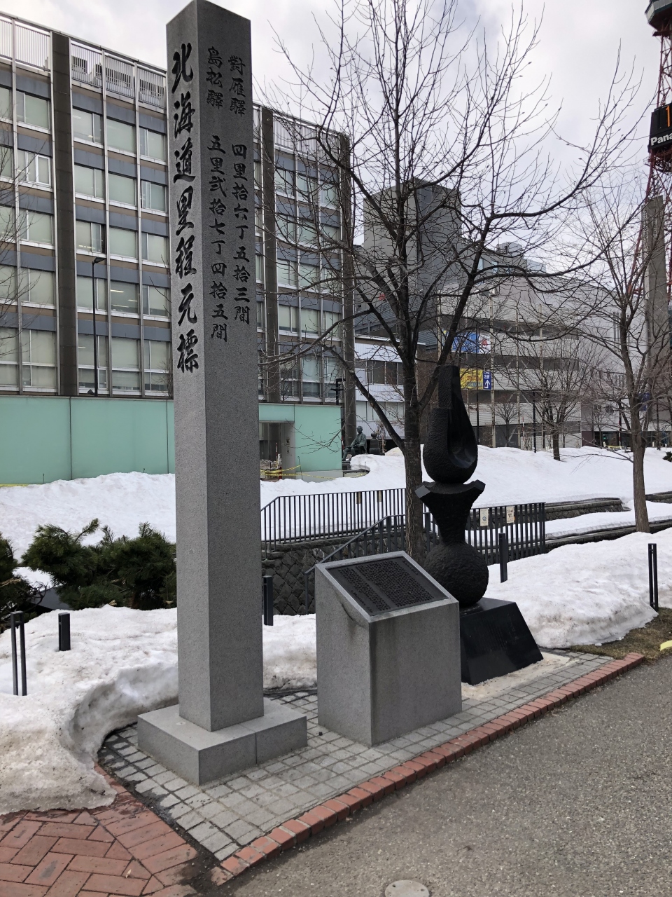 創成橋の袂です。どちらかと言うと、隣にある「北海道里程元標」の方が目立っていました。札幌建設の碑は、その右にある黒いモニュメントです。台座には、由来が彫られていました。札幌市は、この場所を起点として発展したそうです。現在は、繁華街からは少し外れた場所なので、少し意外に感じました。