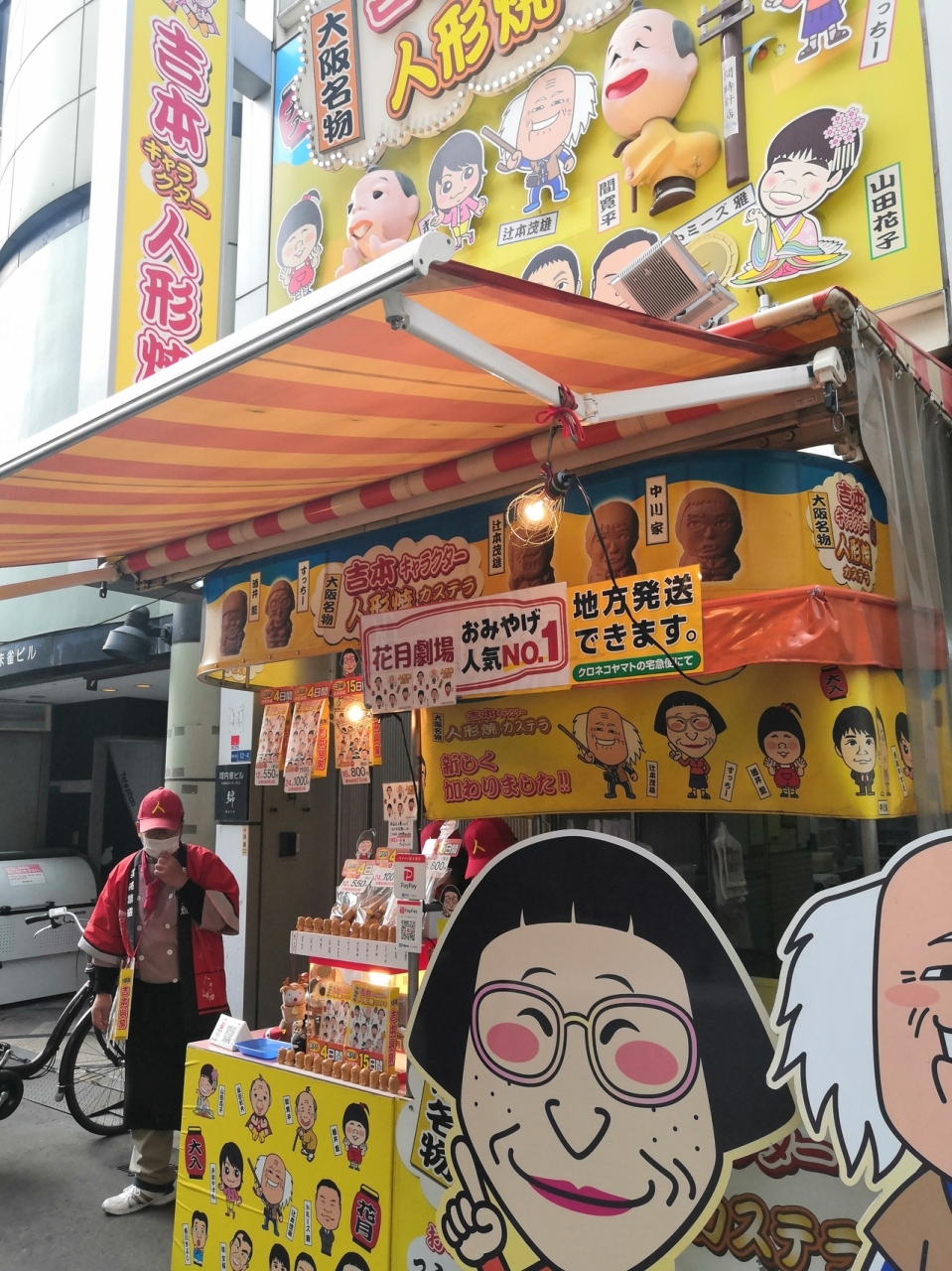 なんばグランド花月の正面にあります。新喜劇の人気キャラクターが人形焼になっています。典型的な観光客向けの商品でお土産にはそれなりに向いているとは思います。ホームページに見せると割引になるQRコードがあります。