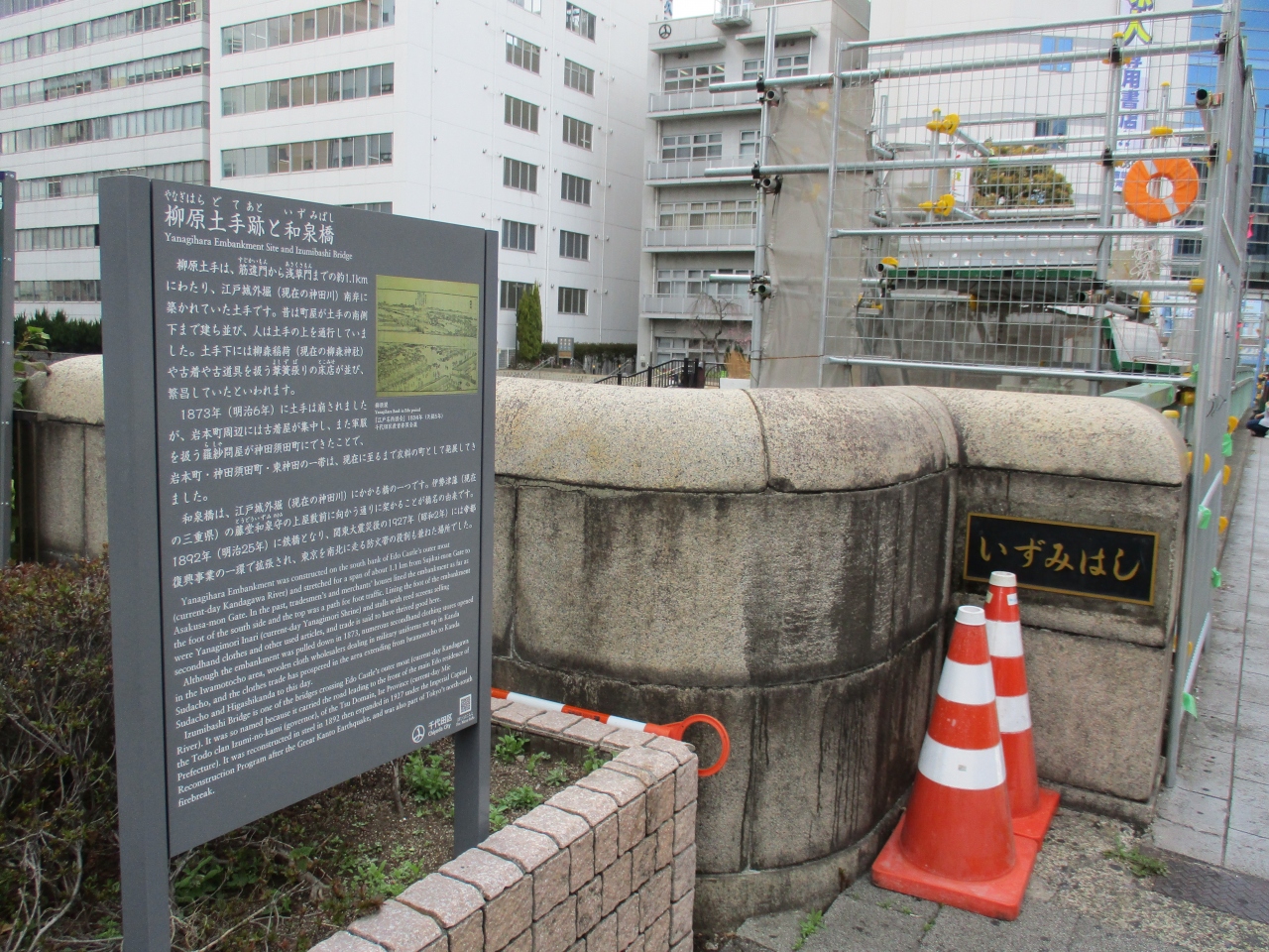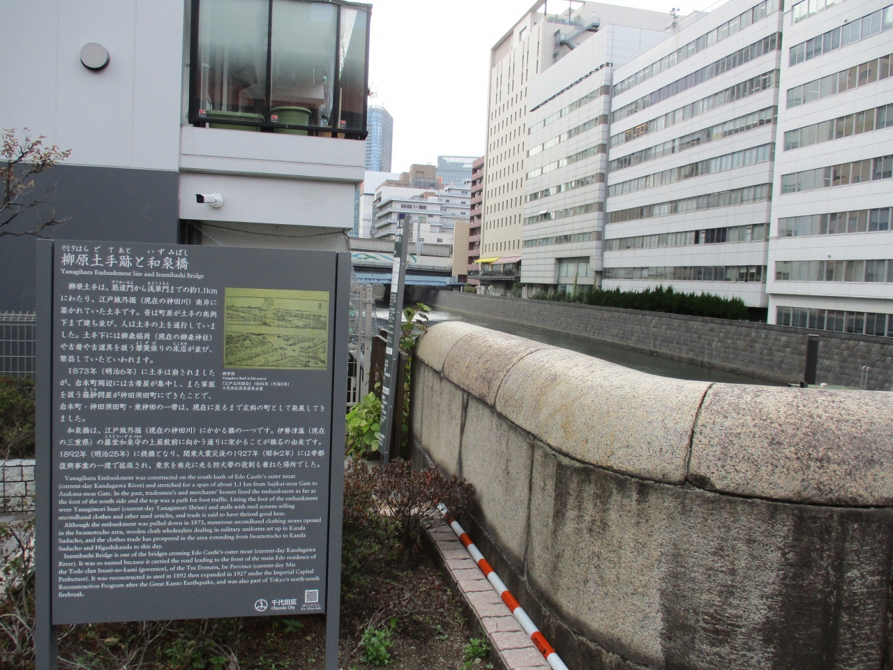 御徒町から昭和通り沿いに都営地下鉄の岩本町駅に乗り換えをするときに、和泉橋を渡ったところに案内板が立てられています。ちょうど神田川沿いで、昔は川の土手を柳原土手と呼んでいた案内です。案内板には江戸名所図会が描かれていて、当時の様子を知ることができて良かったです。