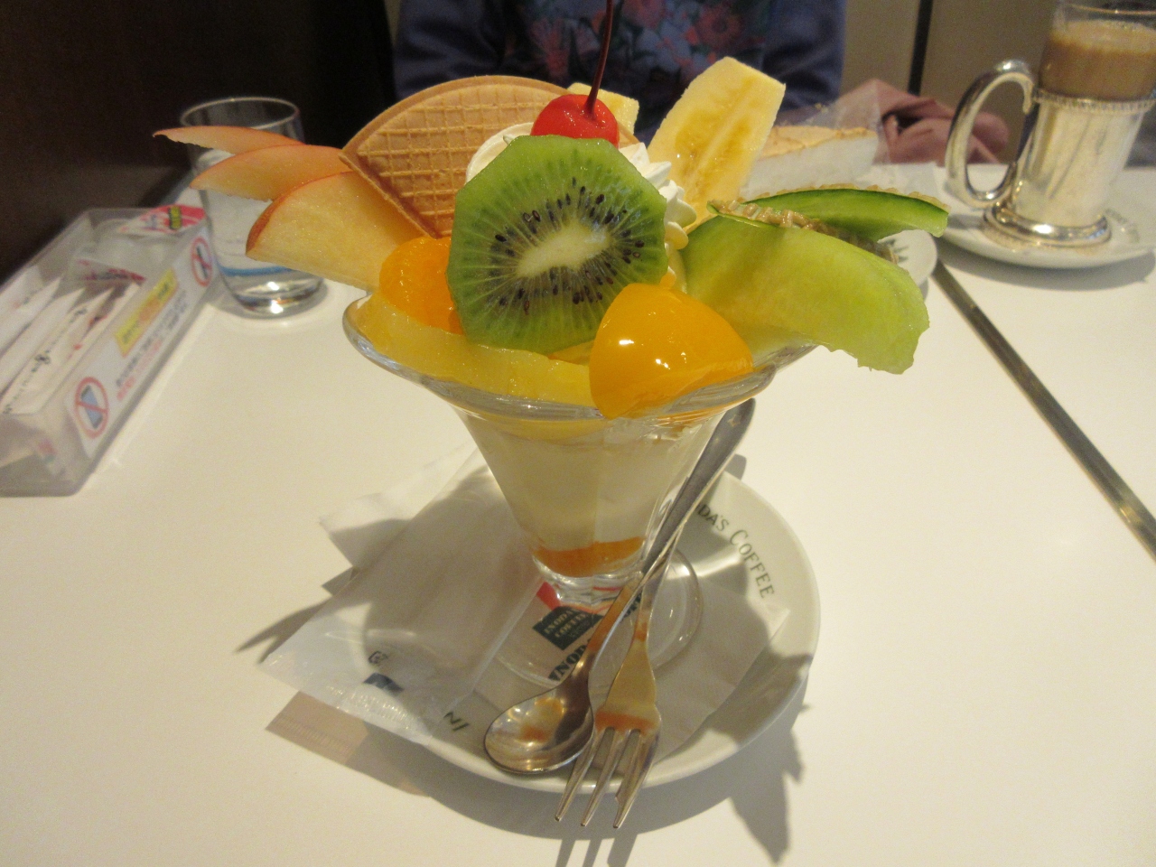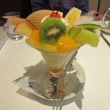 京都駅八条口1階のおもてなし小路にあるイノダコーヒーで休みました。缶詰のフルーツとフレッシュフルーツがのったフルーツパフェのバニラアイスクリームはシャリっとしていて美味しかったです。ケーキセットでホットカフェオレとレモンパイを注文しました。自分のイメージしているレモンパイはレモンカスタードが甘酸っぱいものでしたが、ここのレモンパイはレモン色だけで甘くて期待外れでした。