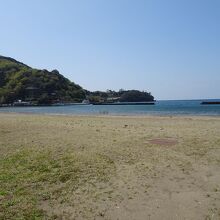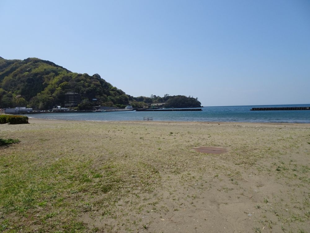 松原公園を抜けると海に出ます。そこが土肥海水浴場です。全面砂浜ではなく、公園側から海に向かって、草が生えた砂地から砂に変わっていきます。