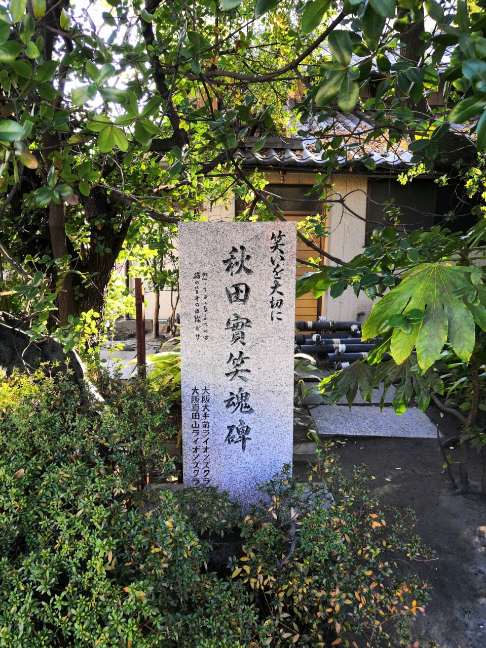 玉造稲荷神社の境内にある漫才作家であった秋田實を追悼する石碑です。この近くの出身で子供の頃はこの境内でも遊んでいたとのことでここで偲ばれるのも頷けます。横にある自然石のほうには辞世の句が刻まれていますが、さすがに読みにくいです。