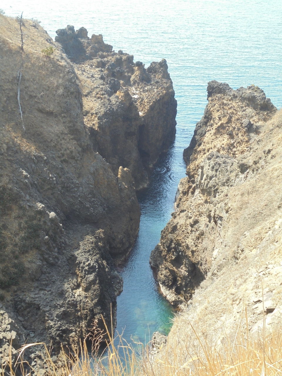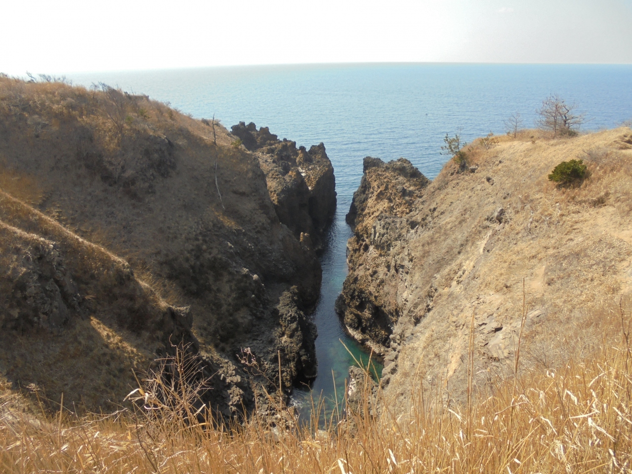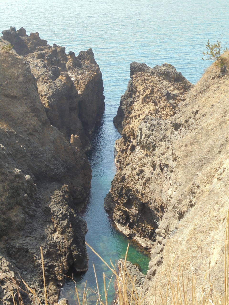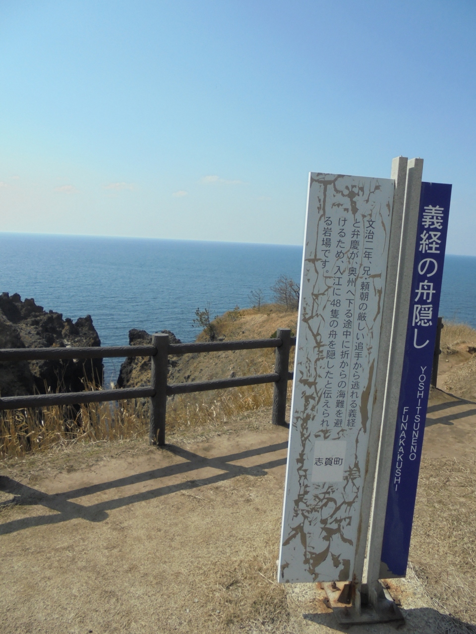 カーナビでも検索しづらくわかりにくいスポットですので、初めて訪れる人は道の駅赤神で尋ねることをお勧めします。親切・丁寧に教えてくれますよ。ヤセの断崖を目印にして、遊歩道を2・3分ほど歩けば着けます。看板が立っているからここだとわかりますが、看板がなければスッと通り過ぎてしまいそう。百メートルほど眼下に自然にできた入江を源義経はよく見つけたものだと感心しきり。なるほど、手前の奥まで舟を引き入れれば敵からはまず見つからない。写真撮影する際は縦位置で撮影すると奥行感が強調されて迫力が出ます。