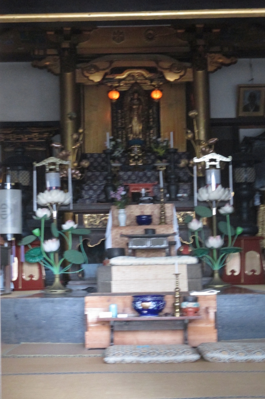 永福寺はいでゆ坂の湯あみ堂本舗から少し下ったところにありました。いでゆ坂から覗くと、正面には温泉閣旅館の玄関が見えてしまいます。さらに回り込むと、本堂がありました。柱には、右に「日本第一蒸湯開基」、左に「一遍上人安置道場」と下がっていました。鉄輪温泉は一遍上人が開いたといわれていますから、その一遍上人所縁のお寺さんなのですね。
