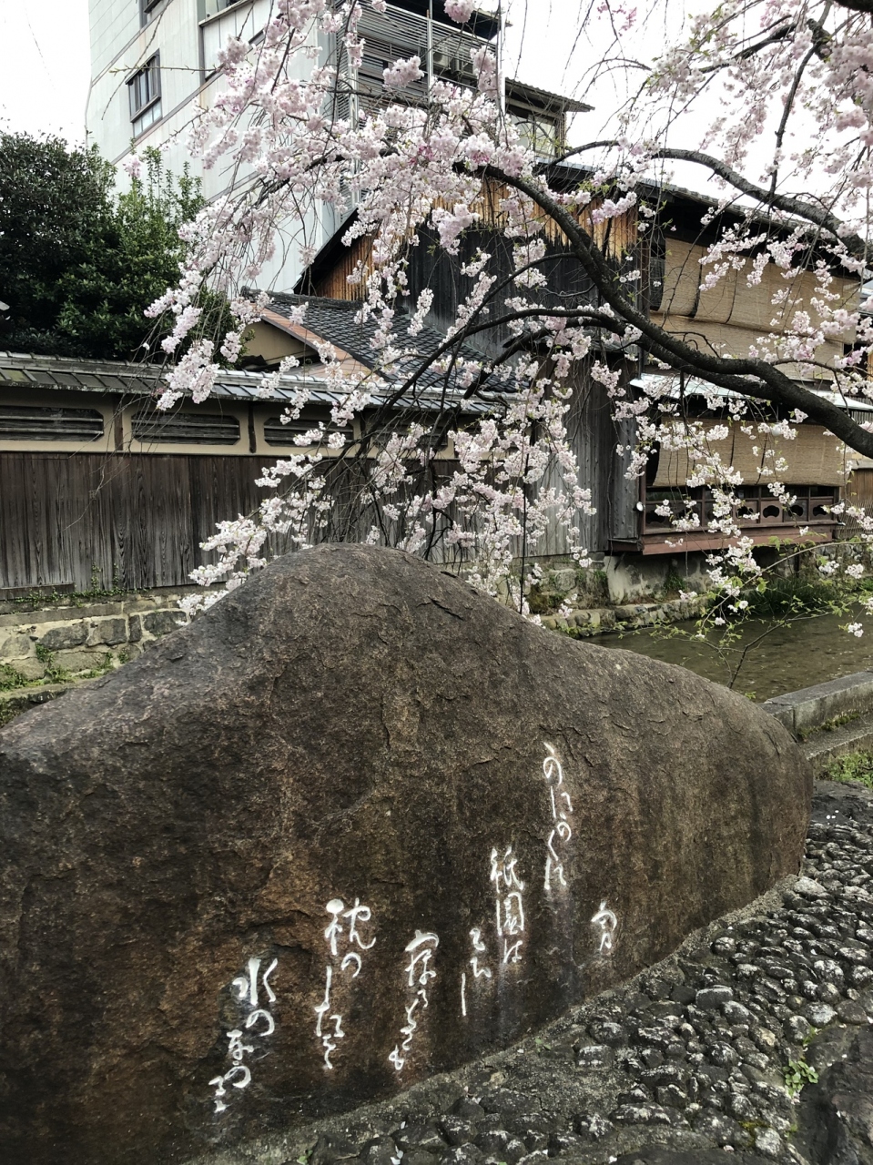 祇園をこよなく愛した歌人として知られる吉井勇が明治四十三年に詠んだ一首。春になると白川沿いに植えられた桜が満開となり、この時期は、特に観光客の方で賑わいます。桜とかにかくに碑を写真に撮ろうとしたら、奥のお店に芸子さんが何人かいました。これぞ祇園といった感じの風景です。
