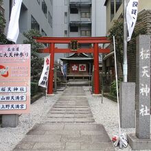 桜通りのビルの間にある細長い神社です。赤い鳥居が目立っています。きれいに整備された神社です。