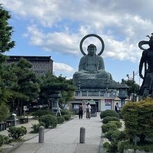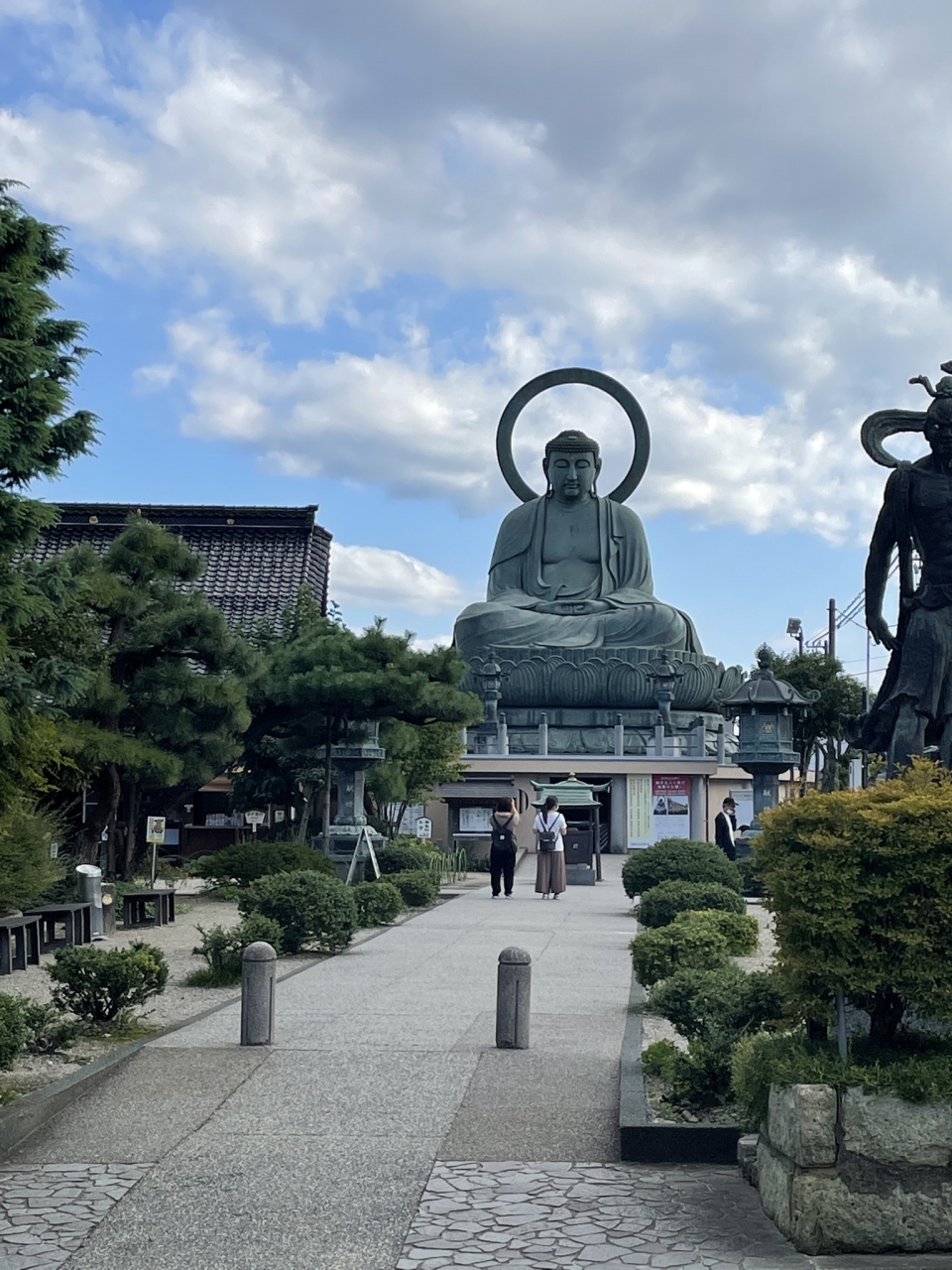 奈良、鎌倉に続く日本三大仏の一つだそうです。イケメン大仏としても有名だそうで、銅器の街高岡ならではの精巧な造りのお顔立ちです。数年前にお色直しとしてぬり直しが行われたそうで深緑のきれいな色合いでした。午前中に坂下町の下、電車通りから見上げるように眺めると西向きの大仏に後光がさしたように見えるらしいです。季節にもよりますが。