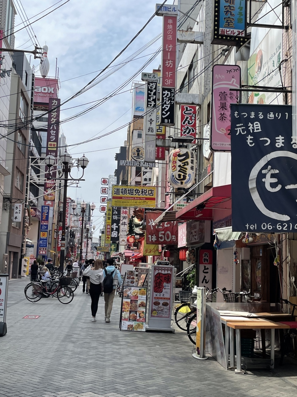 大阪ミナミの代表的な観光地であり飲食店街になっています。車の通らない通り沿いにはたこやき、かに、くしあげなど、派手でリアルな巨大看板がたくさんあり、通りを散策するだけでも楽しいです。実際には食べ歩きが楽しめます。