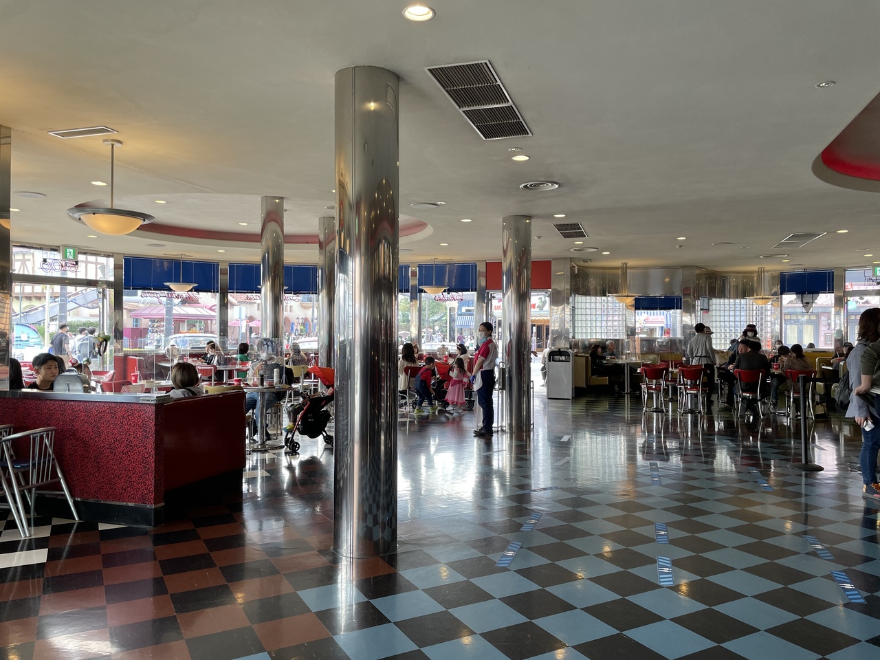 ユニバーサルスタジオ、ハリウッドエリア内のレストランのひとつでアーリーアメリカンな雰囲気です。イメージは映画「アメリカングラフィテイ」の世界です。ボリュームあるハンバーガーがいただけます。店内も広いです。