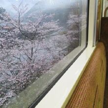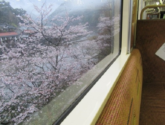 起点は岩国駅0番ホームからの乗車ですが川西駅まではJRとの併用路線になります。車内にはトイレ完備で座席前にはプチテーブルもあり便利で、とにかく車窓からの眺めは素晴らしいですよ、あいにくの小雨でしたが並行し流れる清流錦川を望みこの時期のハイライトである桜が至る所に開花しています。南河内駅付近が菜の花含め最も綺麗でした。