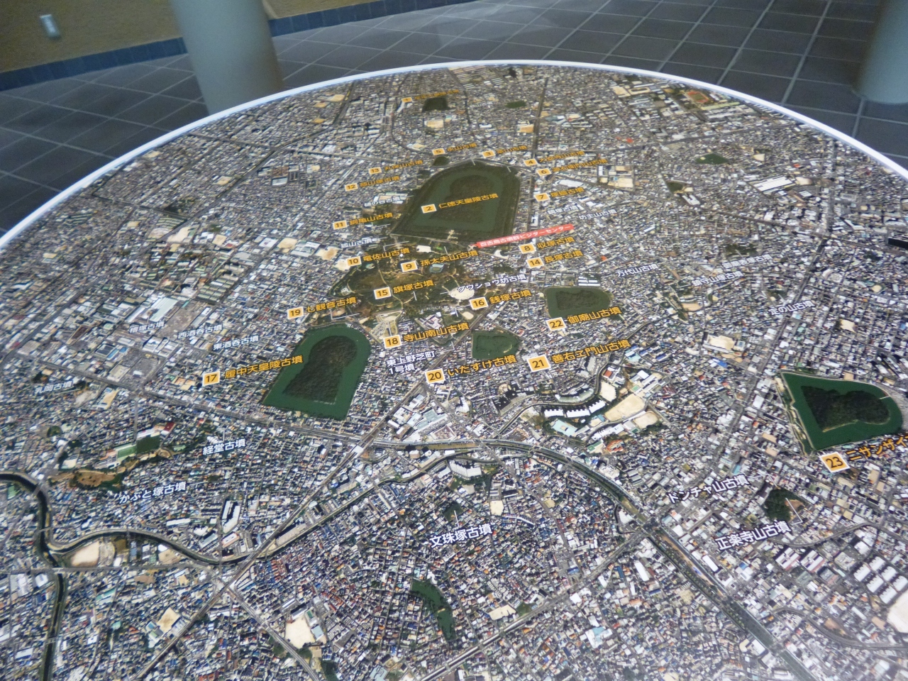 仁徳天皇陵の拝所の東側に百舌鳥古墳群ビジターセンターがあります。百舌鳥・古市古墳群の全容をこちらで知ることができます。空撮映像で古墳群の広がりや大きさを体感することができます。訪問した時は、市役所の展望ロビーが閉鎖になっていて上から見ることができなかったので、こちらで、映像ですが見ることができて雰囲気をつかむことができました。