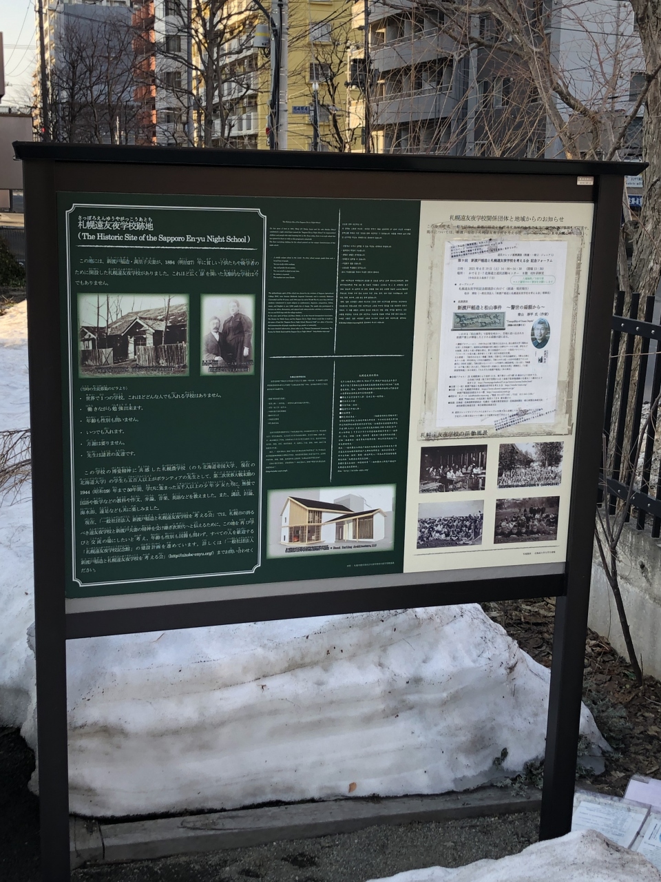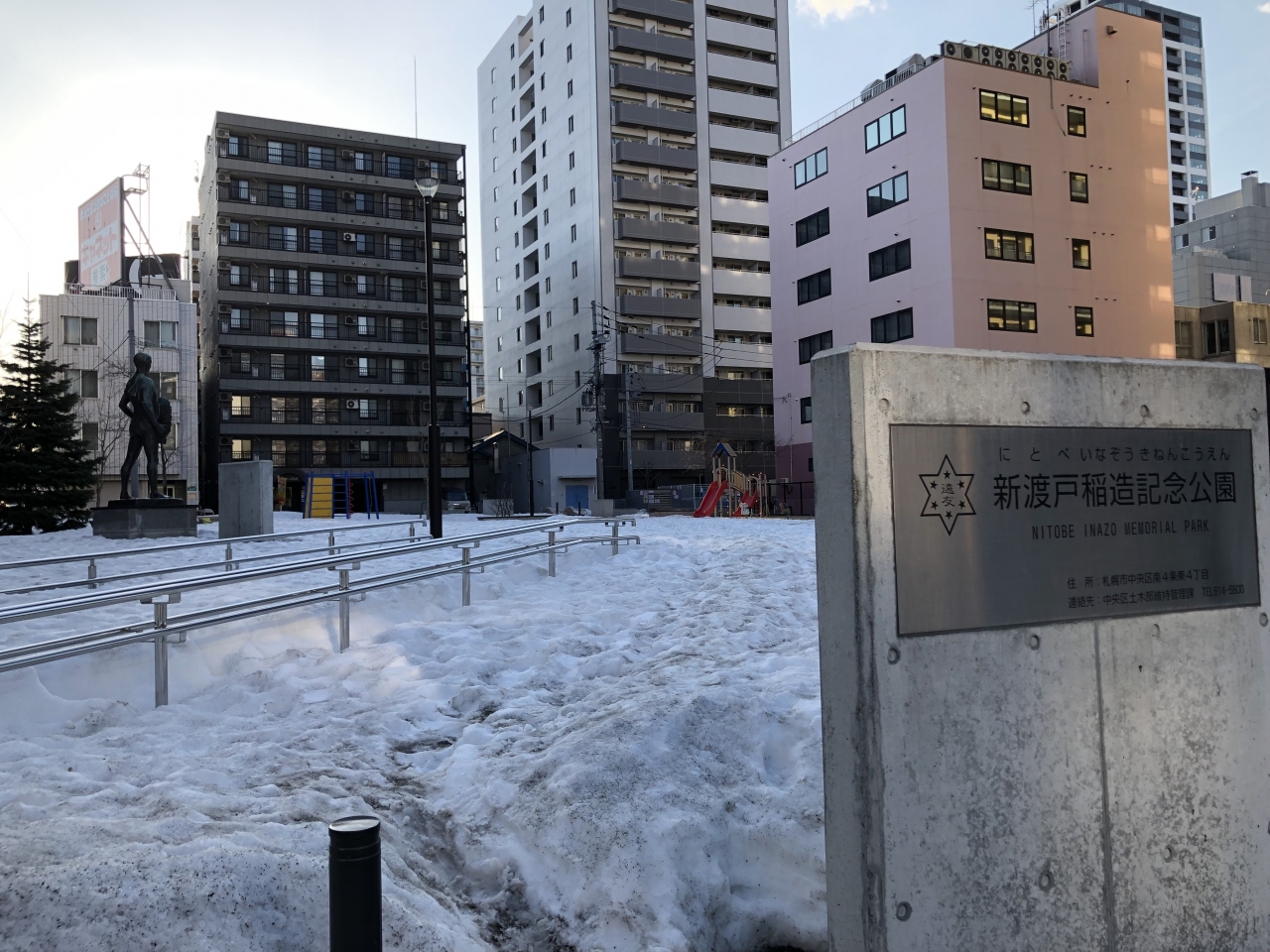 豊平川の近くにある「新渡戸稲造記念公園」内に設置されています。かつて、この地に、新渡戸稲造夫妻が開設した札幌遠友夜学校があった縁で、ここが記念公園となっているようです。公園の入口すぐの所に、顕彰碑が設置されていました。ただ、冬期は除雪がされないようで、公園自体が雪に埋もれていました。せっかく行くなら、雪のない時期をお勧めします。