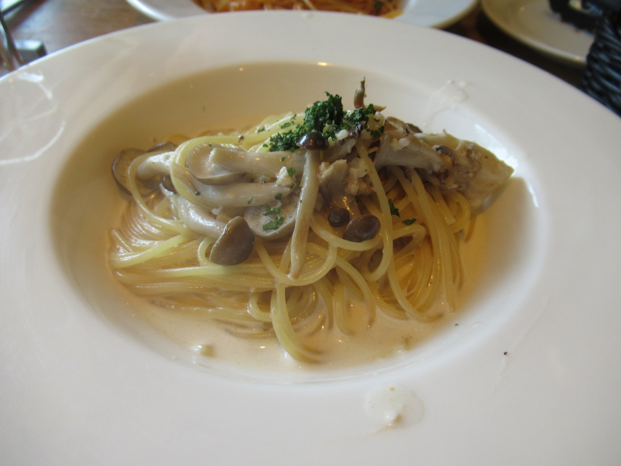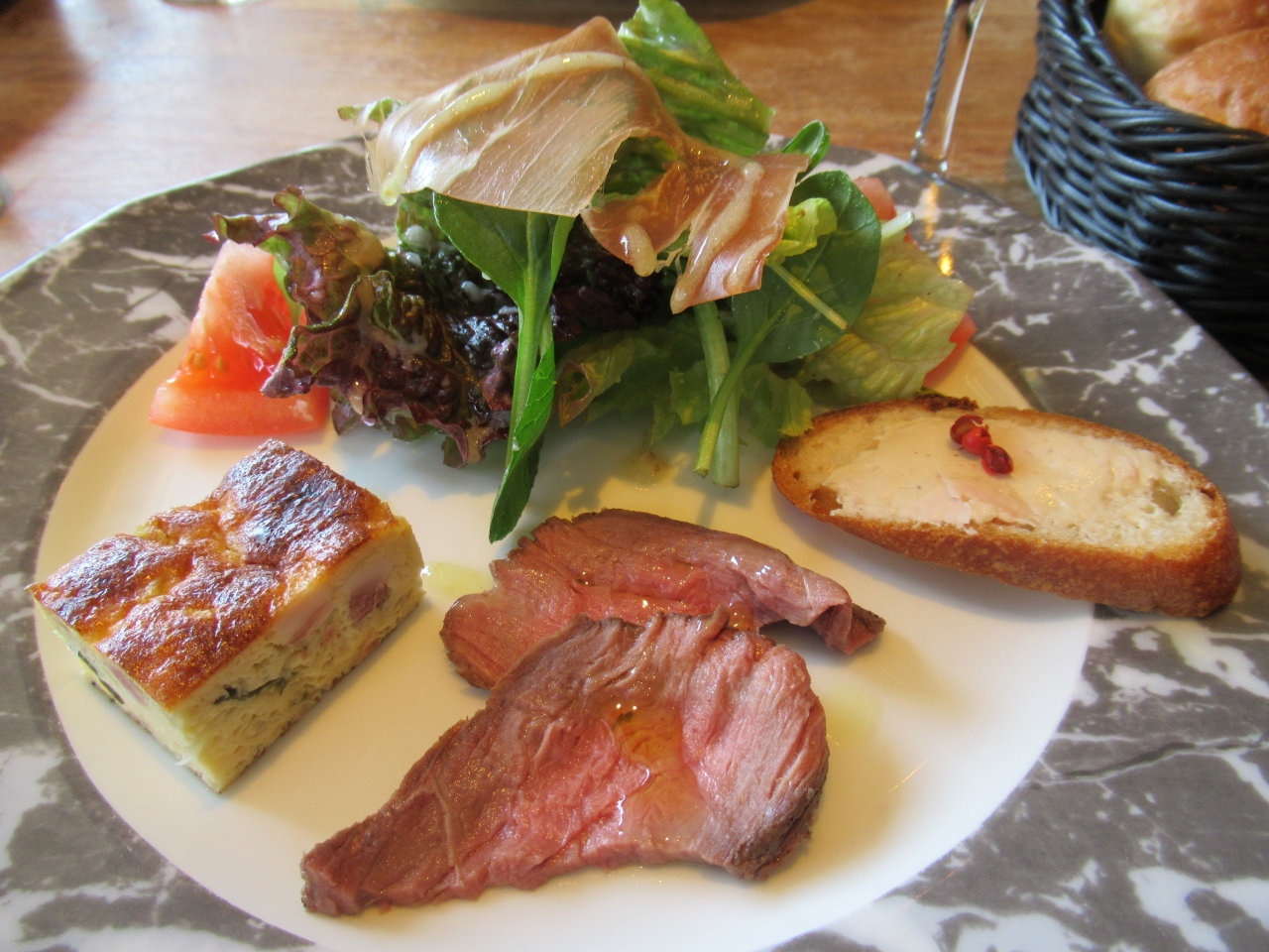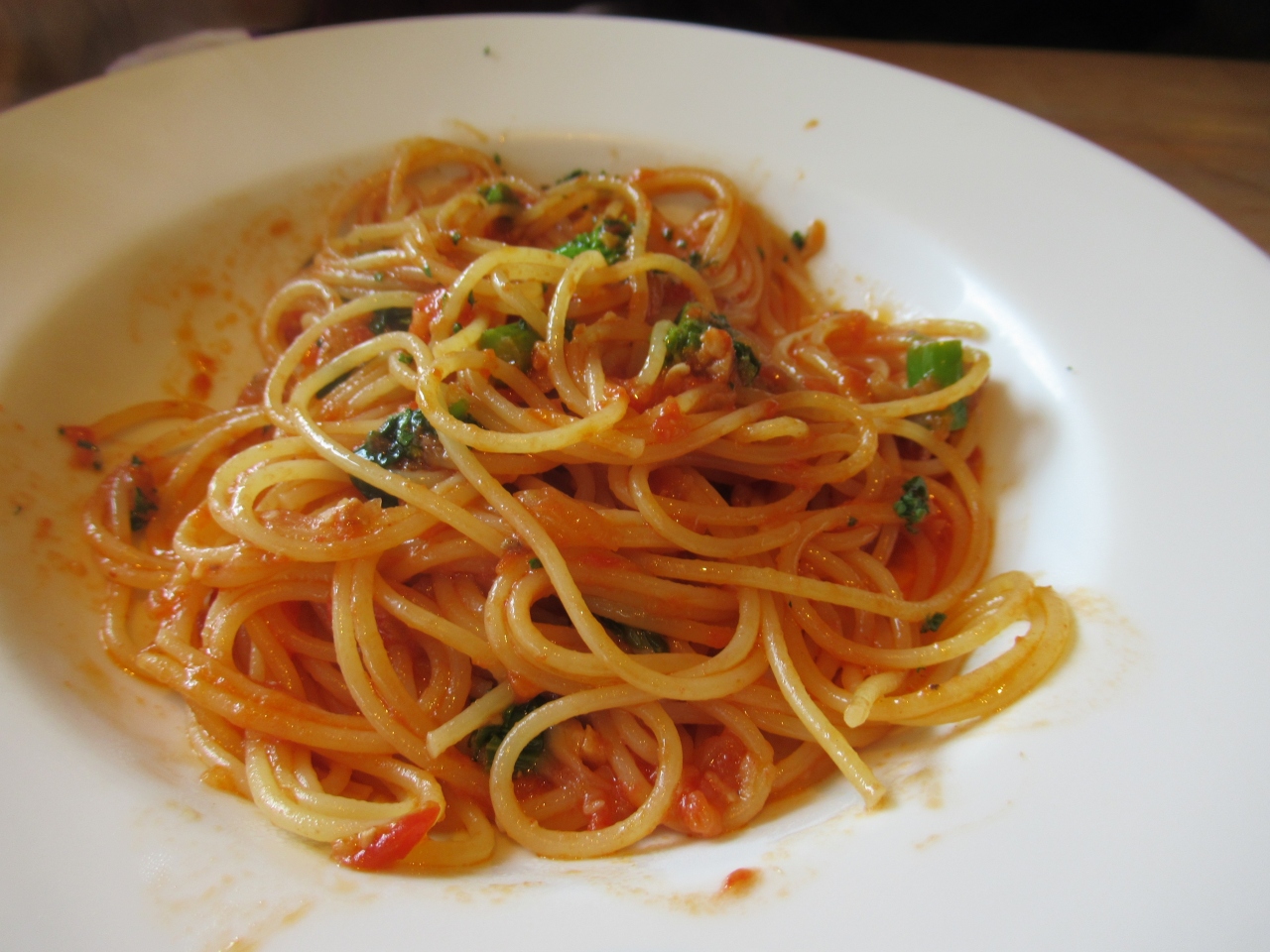 ランチメニューから前菜、パスタ、飲み物のパスタセットグランデにして、奥さんだけデザートをつけました。