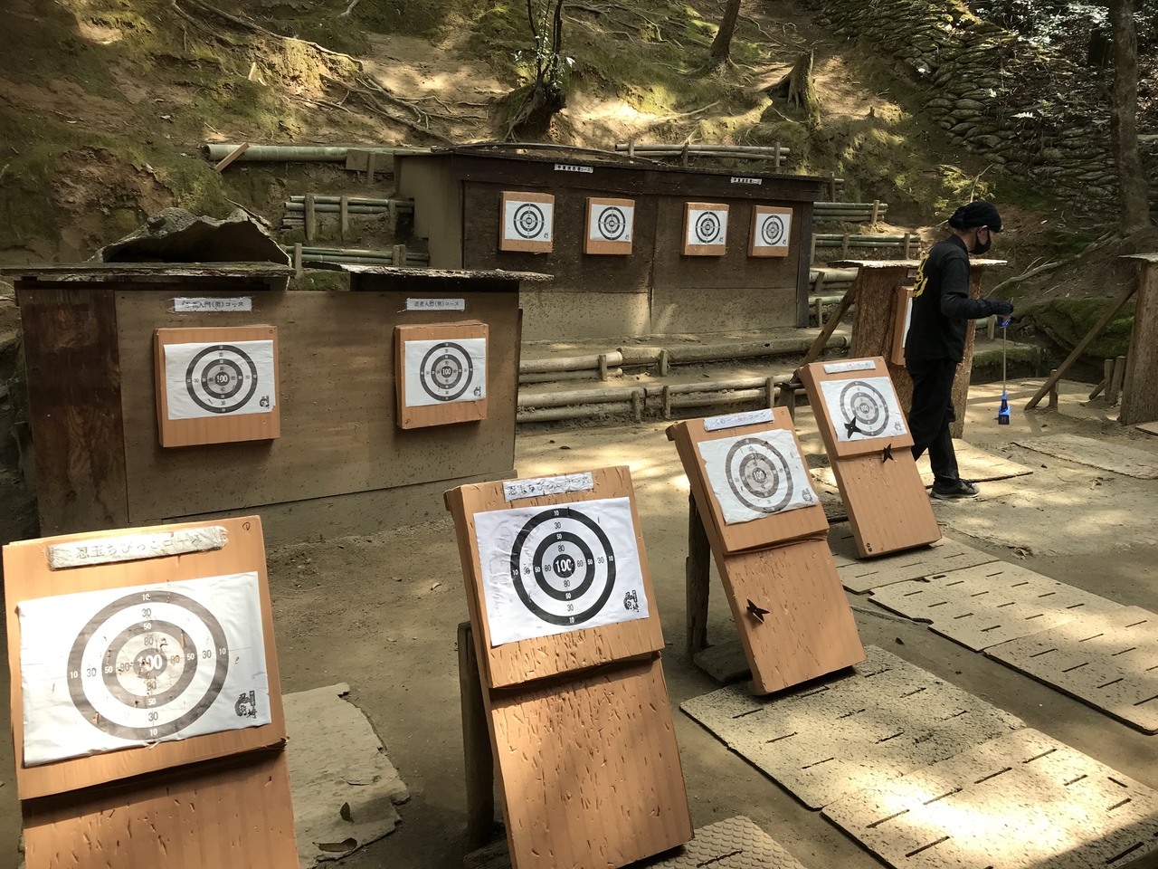 手裏剣の投げ方を指導していただき、みんなで板に投げました。
