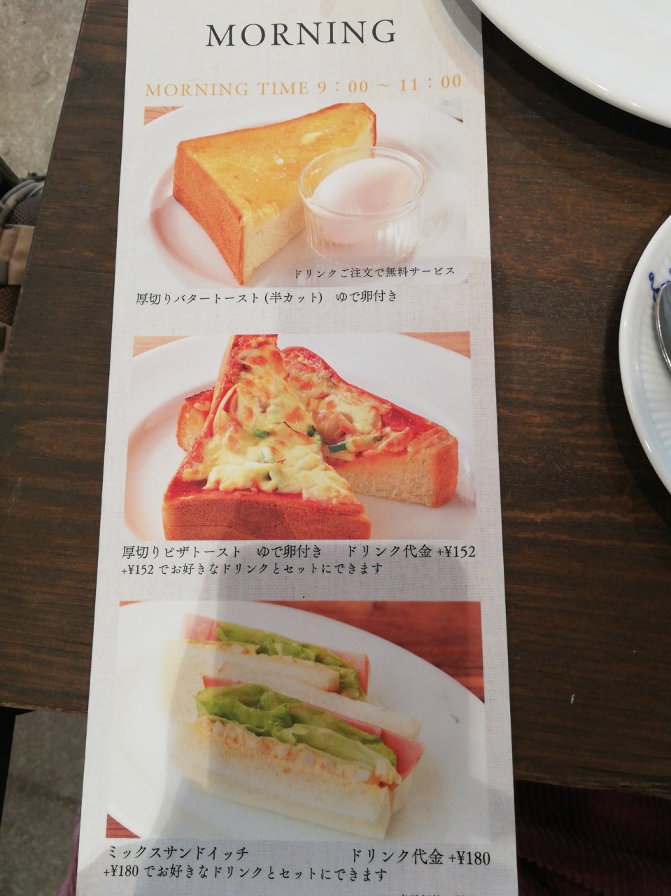 11時まではモーニングをやっていて、トーストとゆで卵は無料、サンドイッチは180円でドリンクに追加できます。