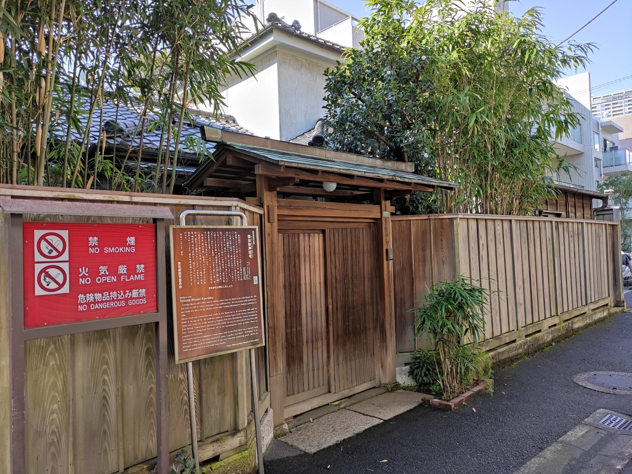 東京大学の赤門近くの住宅街にありました。明治・大正・昭和にかけて活躍した自然主義文学の巨匠の徳田秋声の旧宅だそうです。木造の門が印象的ですが、どなたか今でも住んでおられるのか、特に公開されている様子はなかったです。