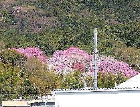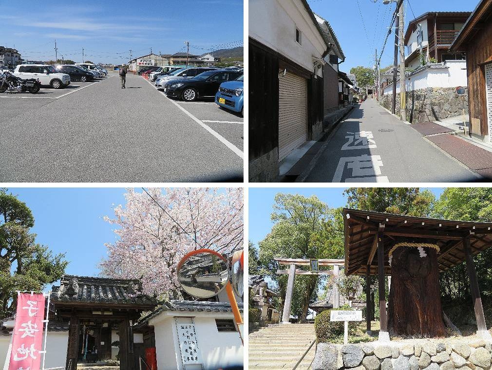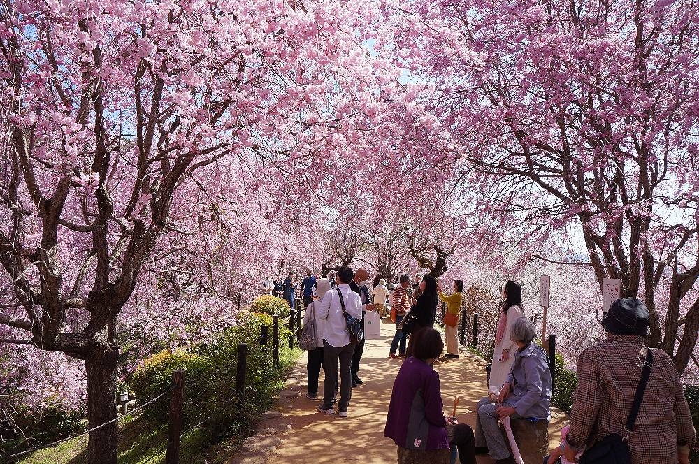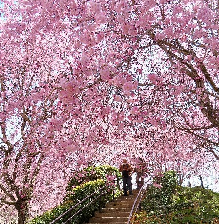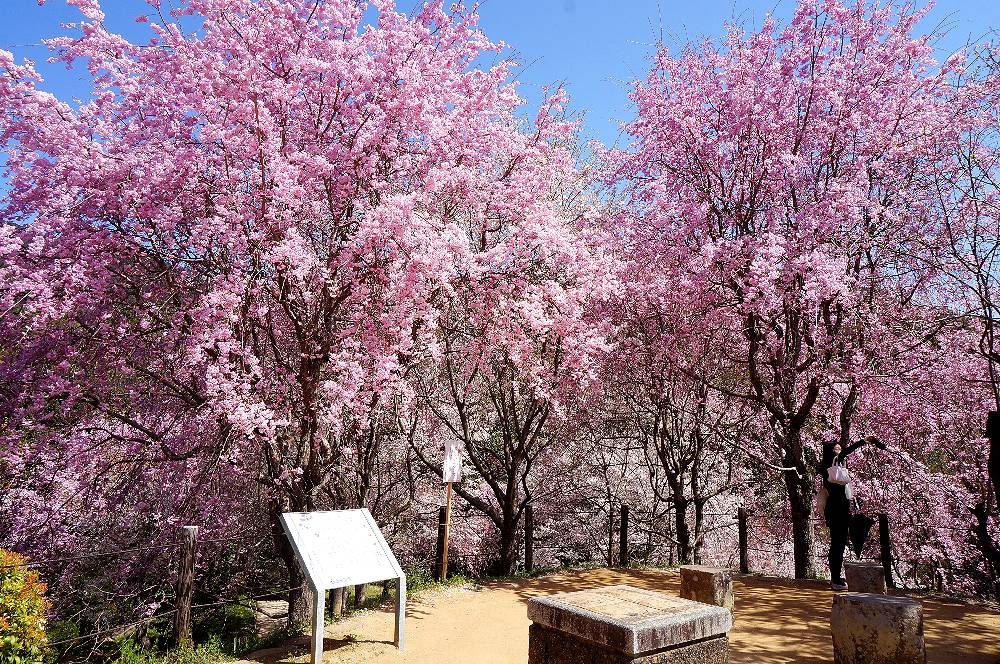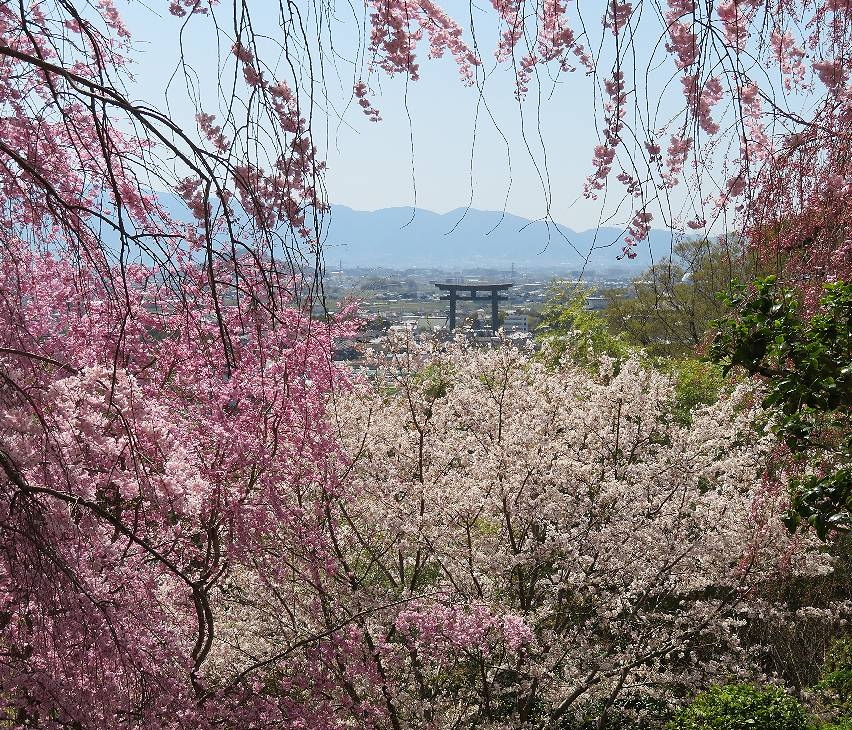 2022年4月5日(火)の昼過ぎにレンタカーで訪れました。無料駐車場は広く、すんなり駐車できました。駐車場からも山の中腹がピンクに染まった桜の塊が見えるので、方向を間違えることはありません。神社の鳥居手前を左に曲がり、お店が並ぶ狭い道に入り、突き当りを右折してしばらく歩いた先にある小高い丘が大美和の杜展望台で、春は枝垂桜が隙間なく咲き、カーテンのように周囲を枝垂桜で覆いつくし、まるでそこが桃源郷のようでした。ここの存在を知ったのはつい最近のことで、京都の桜の名所程は有名ではないようですが、これほどの美しい桜は見たことがありません。ぜひ、見頃を迎えた晴天の日に、訪れて欲しいところです。
