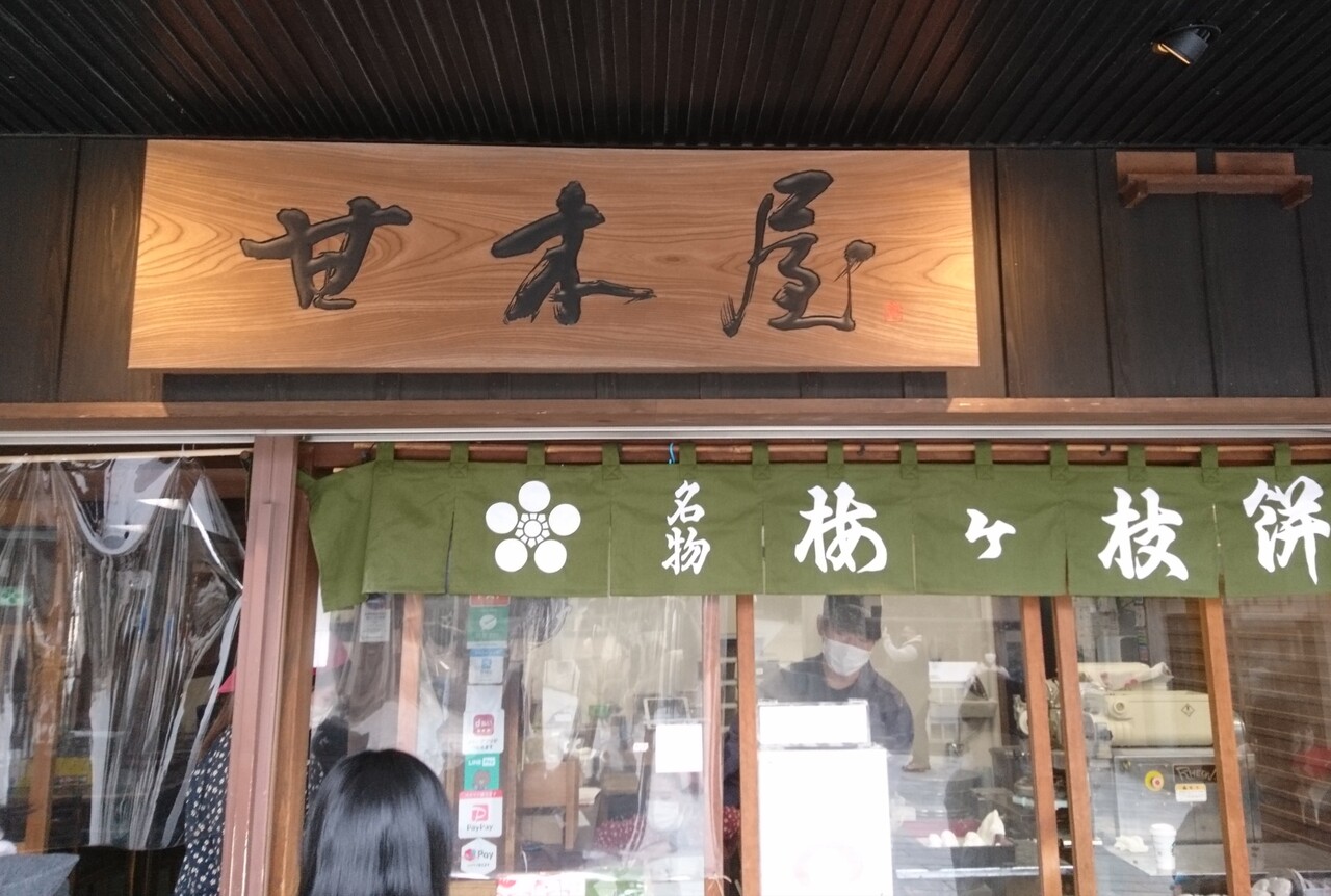 太宰府天満宮参道鳥居前の木造三階建が甘木屋で歴史ある太宰府市指定景観重要建造物になっています。