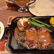 頂いたのは勿論オリジナルハンバーグ。鉄板に乗せられた俵型のハンバーグを客前で半分に割って焼くスタイルで、食べる前から食欲が湧きます。粗びきの挽肉は程よい硬さ、またソースが美味しいです。少し値段は高いと思いましたが、この味ならば納得。週末入れないのも仕方ないかと思いました。