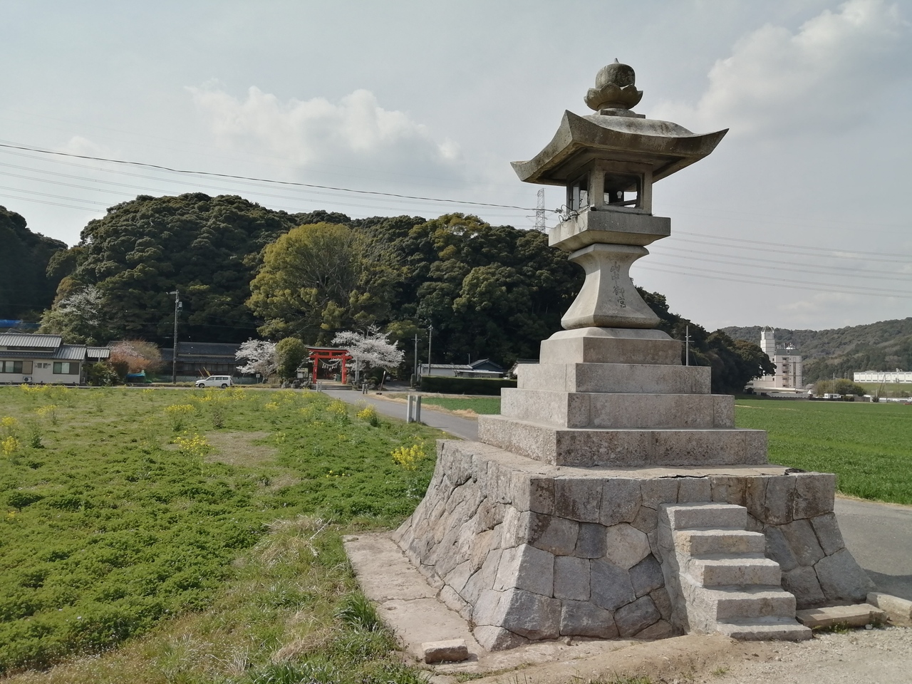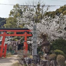 神社前に広がる田園風景、かつての常夜燈も残されておりとてもいい雰囲気。さらにこの時期には桜が美しく、見かけたついでについつい立ち寄ってしまいました。桜と朱塗りの鳥居との景観が素晴らしい。とっても癒やされました。