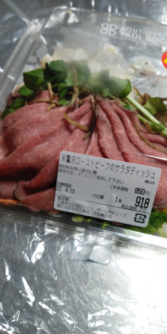 18時頃のお店に行ったら、ローストビーフサラダが2割引きになっていたので購入しました。