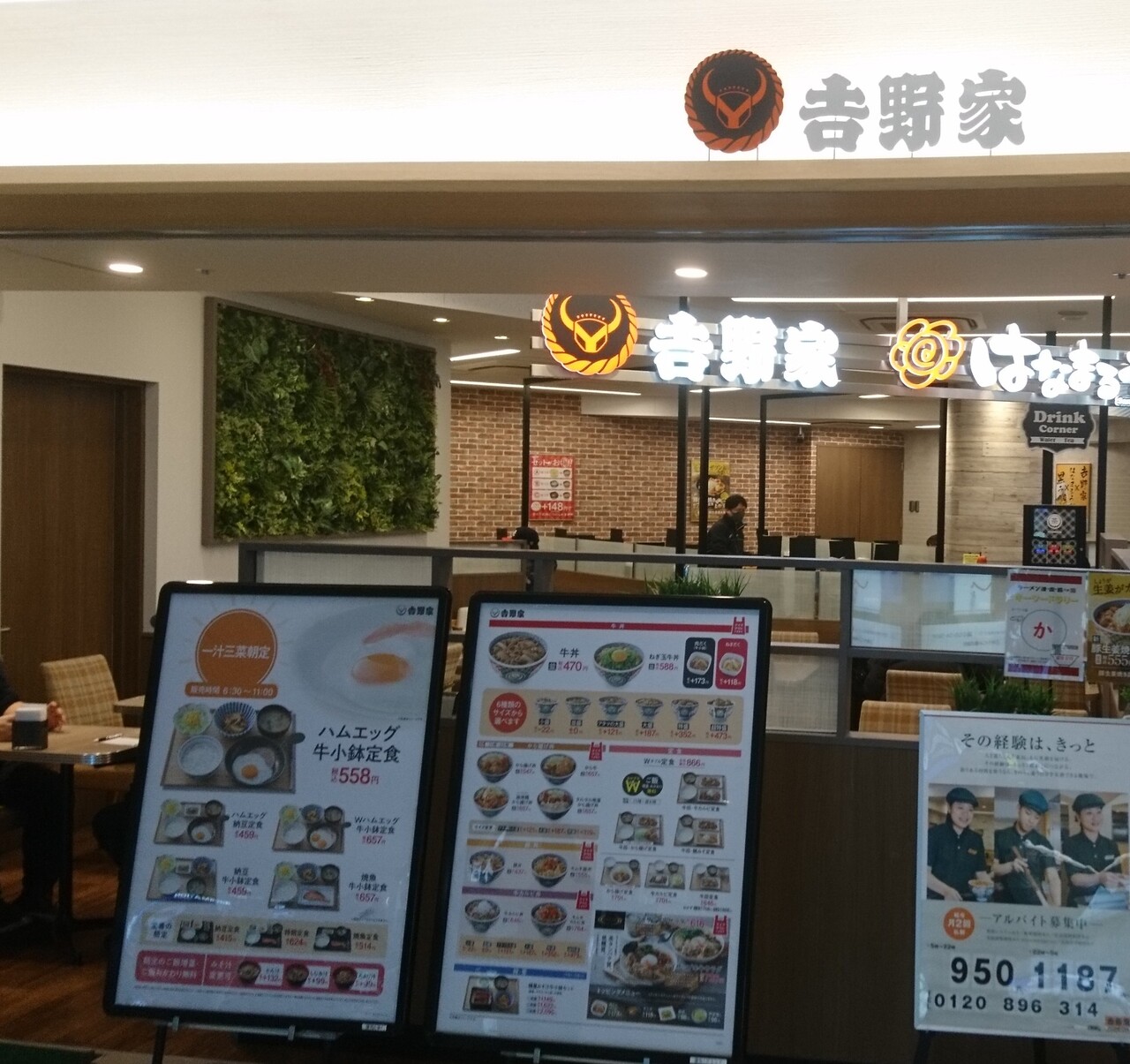 福岡空港国内線ターミナルビルの1Fにある、はなまるうどん併設の吉野家です。