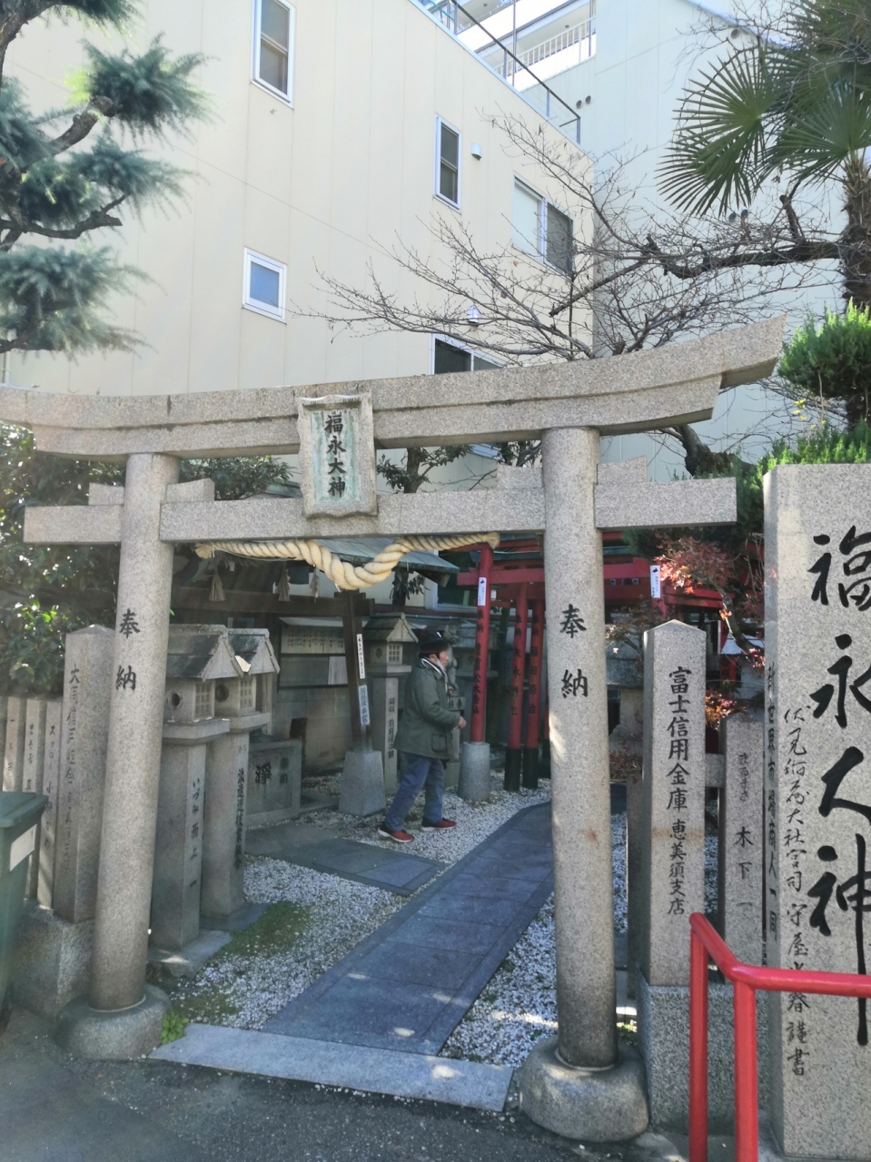 通天閣からほど近い場所にある稲荷神社です。鳥居や石碑には福永大神とあったので、こちらが正式名称で、新世界稲荷神社というのは場所から来た通称なんでしょうか。境内は小さくそれほど見どころないのですが、石で作られたルーレット式の無料おみくじが珍しく、そこがポイントかな。