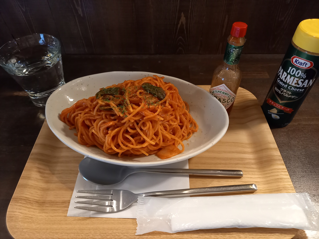 定禅寺通沿いの建物の2階にあります。カウンター3席、テーブル4席です。店内はパンやクッキー、小物類の販売も行っています。ランチはナポリタン、カレー、パンとドリンクのセットの三種類です。今回はナポリタンの単品500円の大盛り100円増しをいただきました。メニューにはドリンク付き700円と書いてありましたが、単品にも出来ました。麺は細麺、味は酸味が強く今までの最強だと思います。カレーはチマチマカレーと言う名前です。大阪にある発酵食堂チマチマで出しているカレーと同じだと言う事でした。次回チャレンジしてみたいと思います。