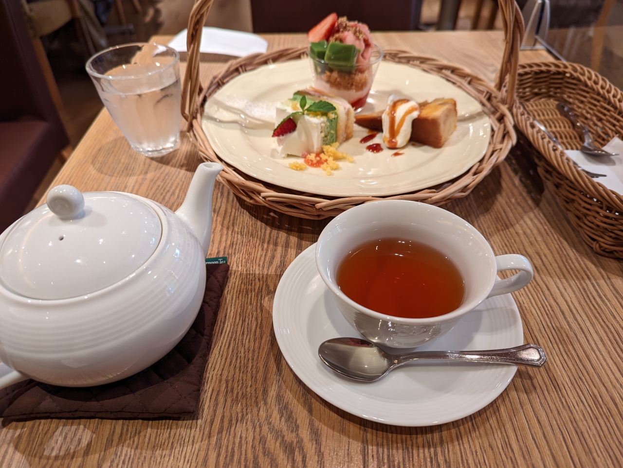 ケーキなどのスイーツ3種類と飲み物が選べます。スイーツは大きすぎず、3種類はペロリといけちゃいます。午後にカフェインをとると眠れなくなる私には、飲み物の中にディカフェの紅茶があったのがとてもありがたかったです。