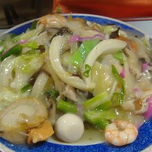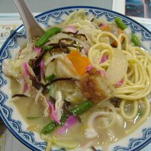 この店では、長崎名物の特製ちゃんぽん・皿うどんが特におすすめで、麺を覆いつくす山盛りの具は約18種類あり、季節感を出す為に旬の具材を使用しています。