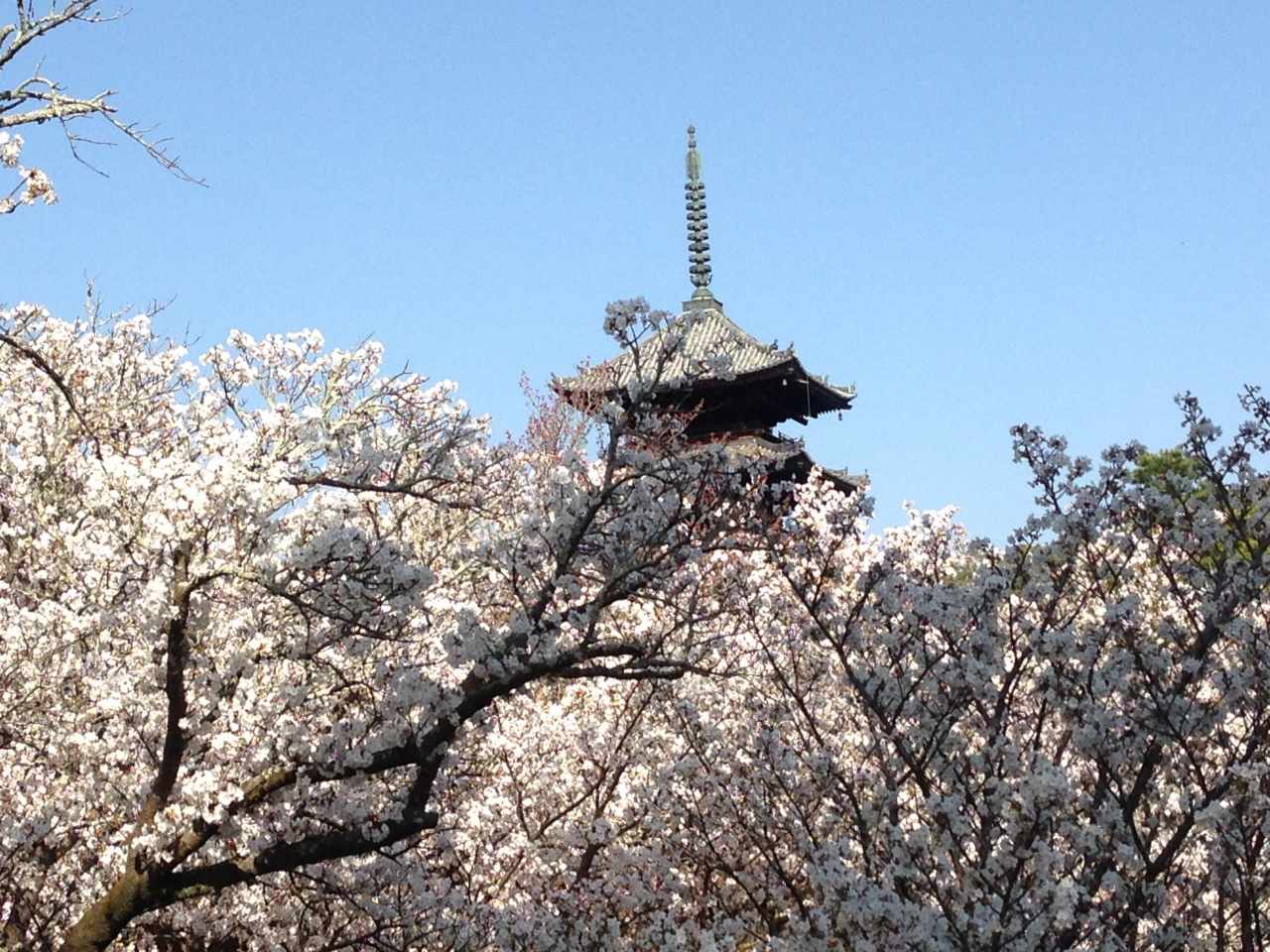 今回はこの時期だけの御室桜を見に行きました。まさに満開で奥の高台から桜と三重塔を見ると最高でした。御室桜だけでなく、寒山という名の八重桜がとても綺麗でした。丁度お坊さんの森山直太朗の“桜”のバイオリン演奏が有り和みましたよ。