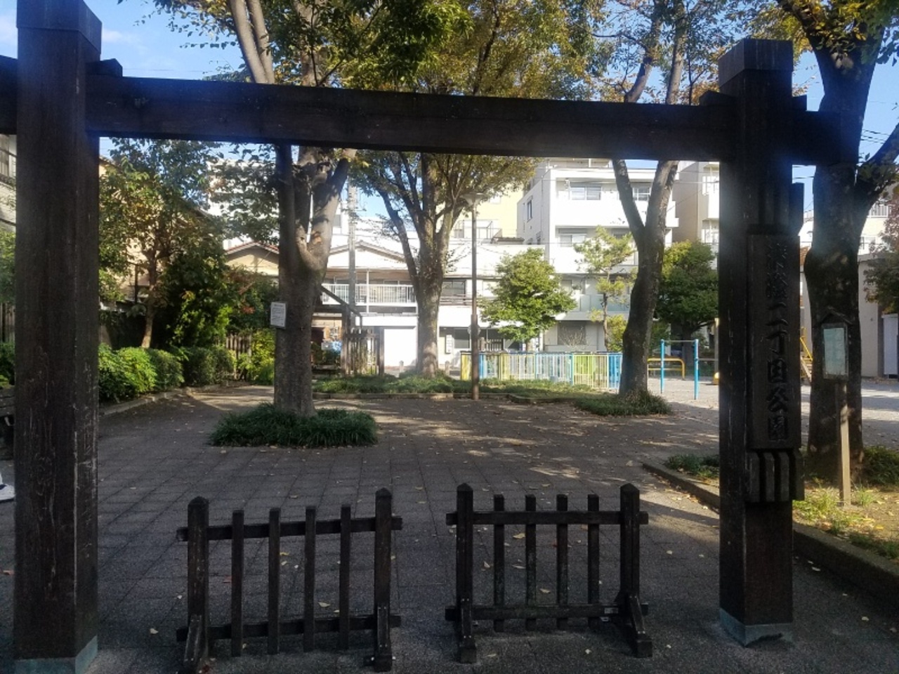 深川稲荷神社から南側の住宅街を歩くとありました。南北が道路に接する形で公園も含めて住宅街がすっきりと区分けされている印象です。しっかりとした遊具もあって周囲のマンションの子供達には良い公園ですね。北側から入って南側から出ましたが南側の入り口は江戸時代の関所みたいな門になっていてくぐるのが楽しかったです。