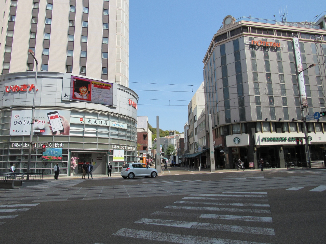 路面電車の大街道駅を挟んで北側の通りが「ロープウェイ商店街」です。南側の「大街道商店街」とは違い、アーケードもなく普通に車が行き来する道路です。