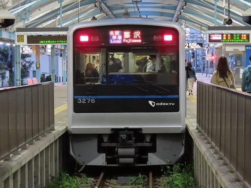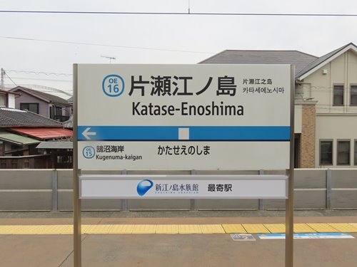 相模大野から片瀬江の島まで全17駅、27.6キロの小田急電鉄の鉄道路線です。この日はわざわざ新宿まで出てロマンスカーGSEで相模大野まで乗ってから、片瀬江ノ島を目指しました。片瀬江ノ島までは藤沢駅で乗り換えるようになっていて、ここで相模大野から乗った急行(8000形)から3000形の普通へ乗り換えました。かたせ