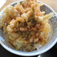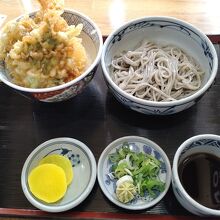 ランチに訪問しましたが、11時~22時までは通常メニューや丼ものとのセットメニューに加えて720円のサーピスメニューがあり、天丼、親子丼、野菜かき揚げ定食、もり丼(後述)(いずれもそば付)はお得感がある。周りを見渡すと、半数以上の方が天丼セットを頼んでいるよう。そこで自分も「天丼セット」をオーダー。