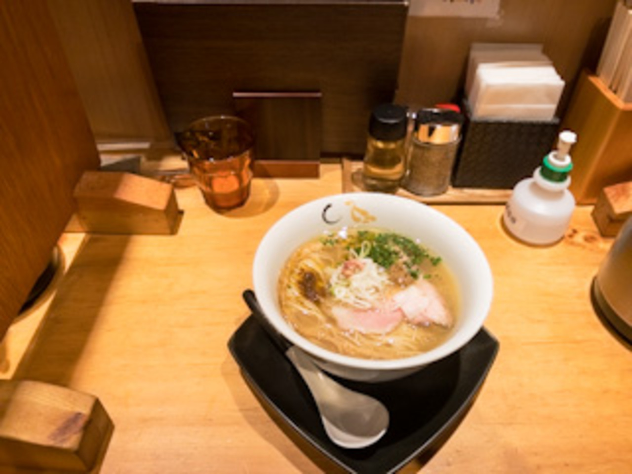 ミシュラン一つ星のラーメン店です。行列を回避するため小雨交じりの天気の日の14時ぐらいに訪問。店の基準メニューの「真鯛と蛤の塩そば」1000円を頂きました。蛤のアロマ、風味が特徴的な塩ラーメンでした。