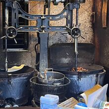 奥にある 大きな釜の中、機械でまわしながら 栗を煎り、焼き上げる様子が 見えます。