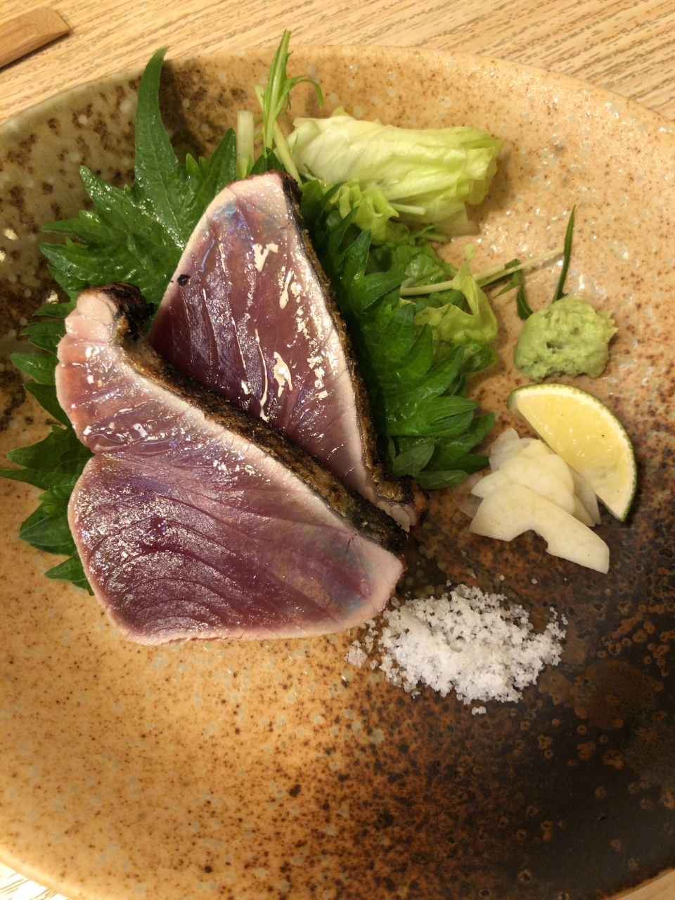 生カツオは本場ではワサビ・ニンニクスライス・塩でいただくそうです、郷に入りては郷に従え!そのように頂きました。(ただし、まだ新幹線に乗るので、ニンニク抜きで) いやあ満足満足!ちりめん丼は半熟卵がとろーりちょうど良い感じ。これでお腹いっぱいで新幹線に乗れますね、ご馳走様でした。
