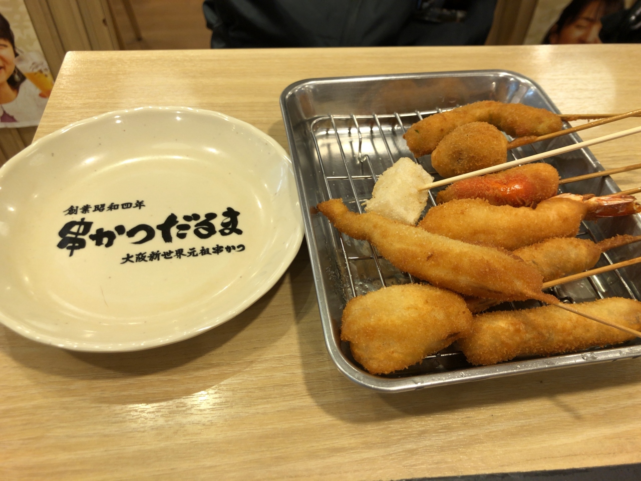 新幹線の改札内にある、フォードコート。ここで串かつ たなか さんの串カツをいただけるなんて、感激です。ソースは個別の皿なので、2度付けOK状態です。自分の好きなように食べられるのは嬉しいですね。これぞ大阪って感じです。ボリュームも満点で大阪を楽しめます。