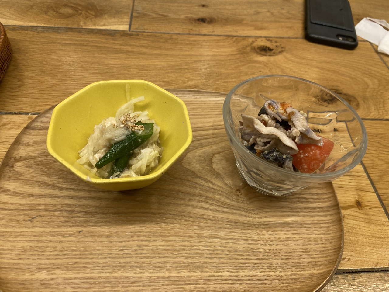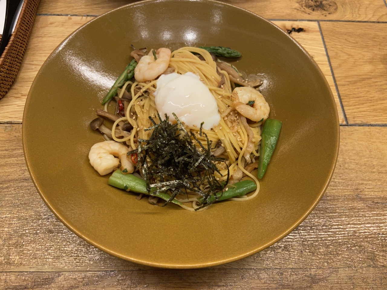 私はアスパラと海老のパスタ+揚げナスとトマトの小鉢。夫はあさりのパスタに蒸しオクラの小鉢。どれもあっさりしていて胃に優しい感じでした。