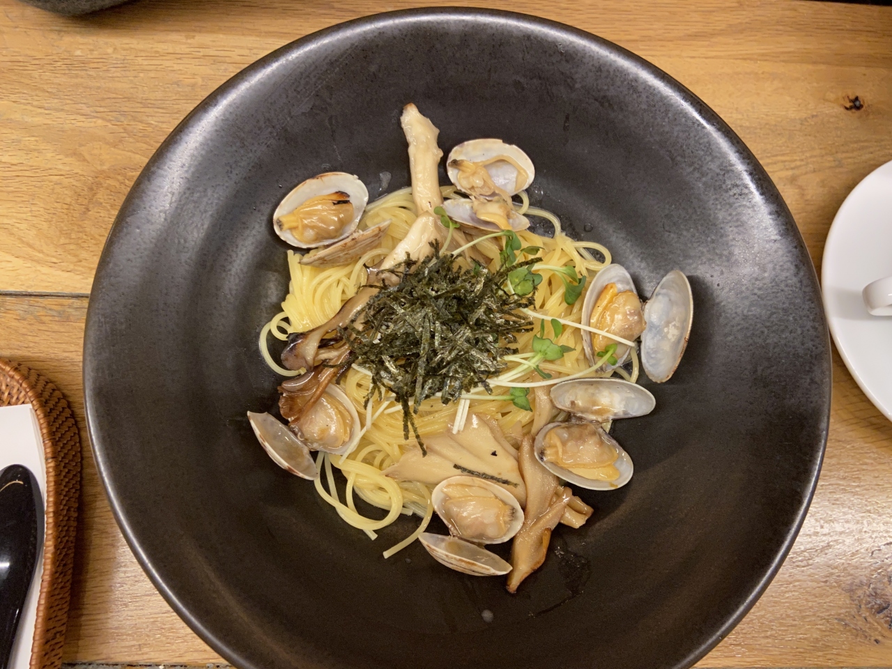 グランベリーパーク内にある、和風だけど若い女の子をターゲットにした雰囲気のパスタ屋さんで年寄り二人でお洒落なパスタをいただきました。