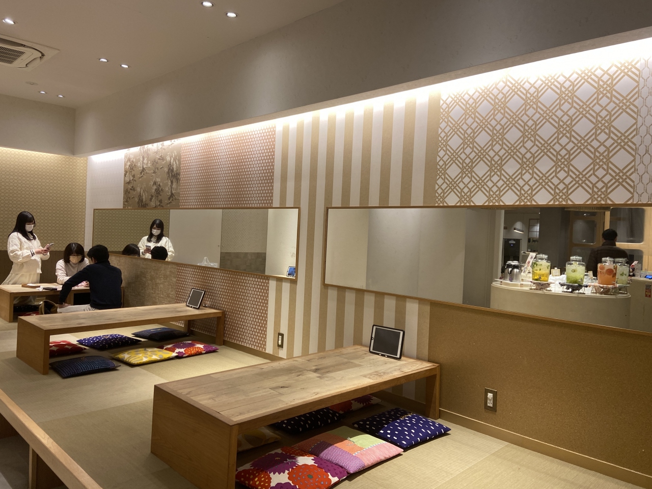 私たちが案内されたのはテーブル席でしたが、可愛らしいお座布団が並んだお座敷席もありました。