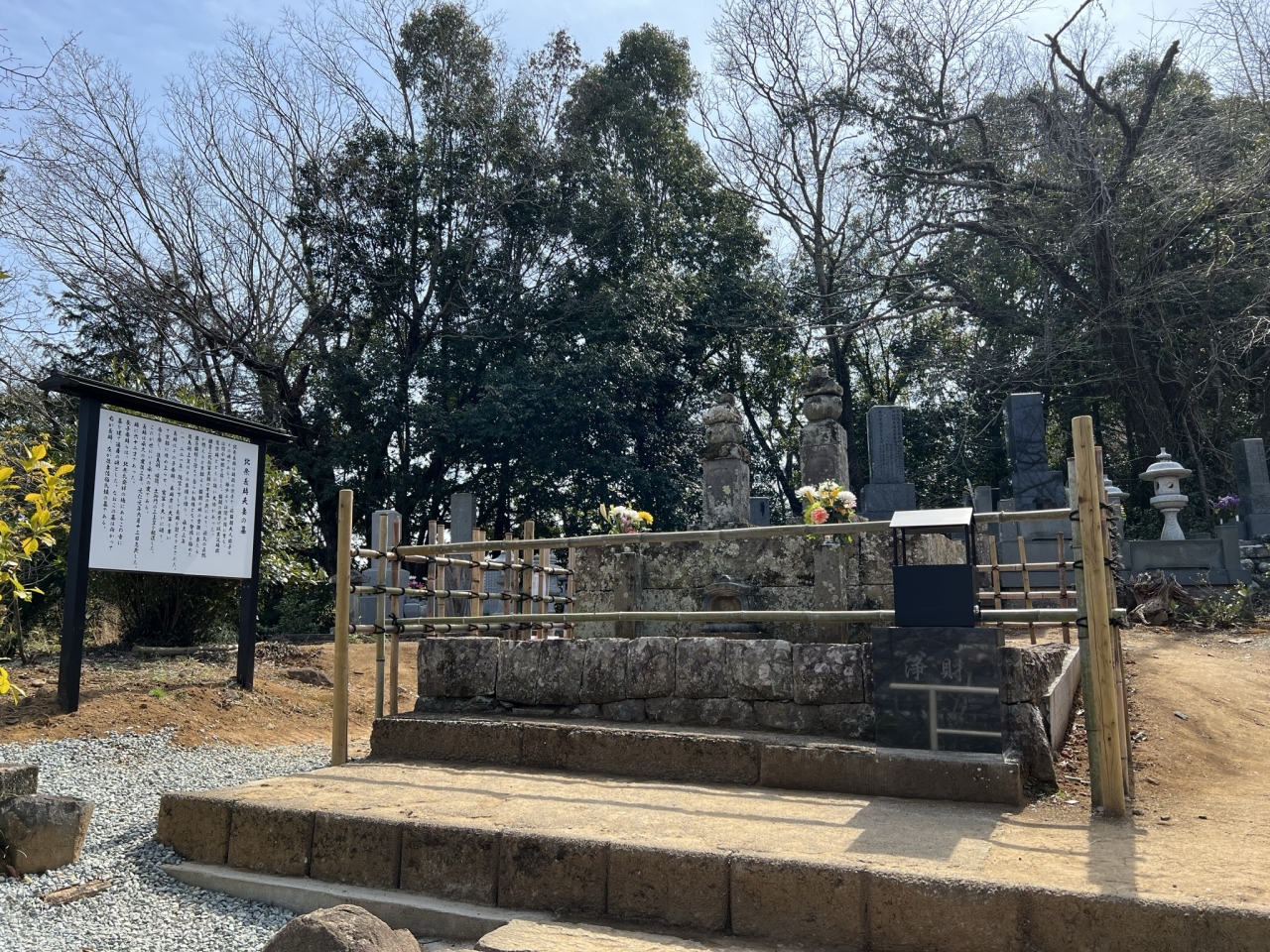 北条義時の館跡(江間公園)から歩いて6分、北条義時が建立した北条寺の墓苑の中に、北条義時夫妻の墓があります。境内の小高い丘の上に、2mを超える高さの石塔が、2つ並んでいます。