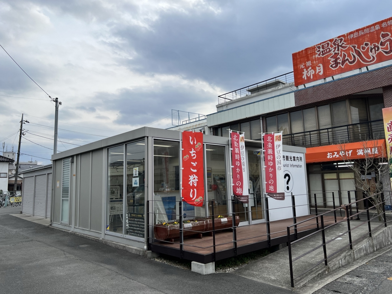 箱根箱根鉄道の伊豆長岡駅の改札を出てすぐのところに、プレハブ小屋のような案内所があります。「伊豆の国市観光案内所」が、今の名称です。案内所の前にある「北条義時ゆかりの地」や「いちご狩り」といった旗指物に目をひかれました。