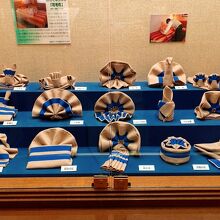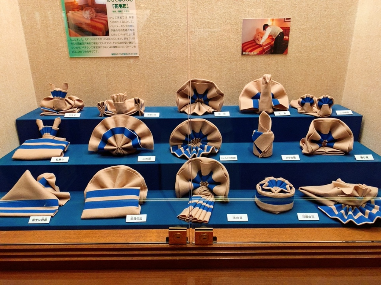 興味深かったのは、左下の写真の"花毛布"の数々。 客船でのおもてなしとして、ベッドメイキングの時に予備の毛布で飾り付けられていたそうです。 ベテランの客室係になると40種類以上のパターンを折ることが出来るとか! 繊細な仕事が日本らしい! 海外だと、バスタオルで白鳥を折ったりするのとか、ネットの記事とかで見たことあったような…。
