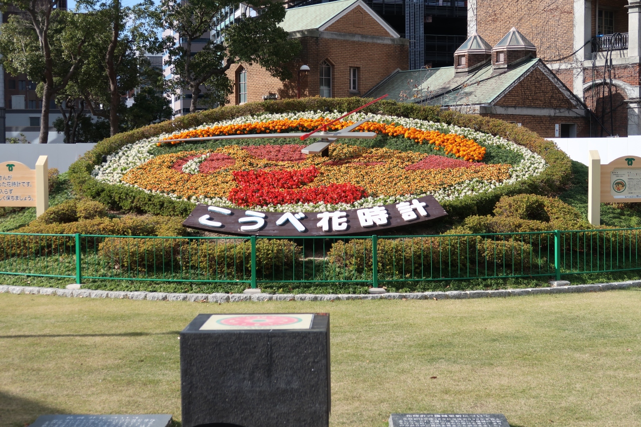 記憶の中では、大きな通り沿いにあったはずの、こうべ花時計が、いつのまにか東遊園地の端っこ、高速道路近くに移動していました。近くの横断歩道の上から、旧居留地時代の社交クラブ、神戸倶楽部の洋館を背景に、きれいに写真撮影できました。花時計と洋館の間には、安藤忠雄氏による子供の本の専門図書館が建てられるそうで、工事中でした。