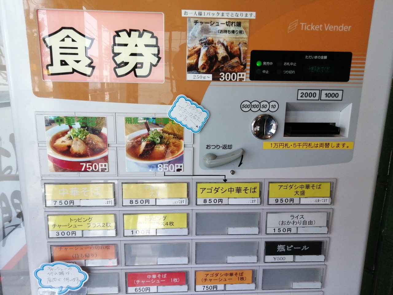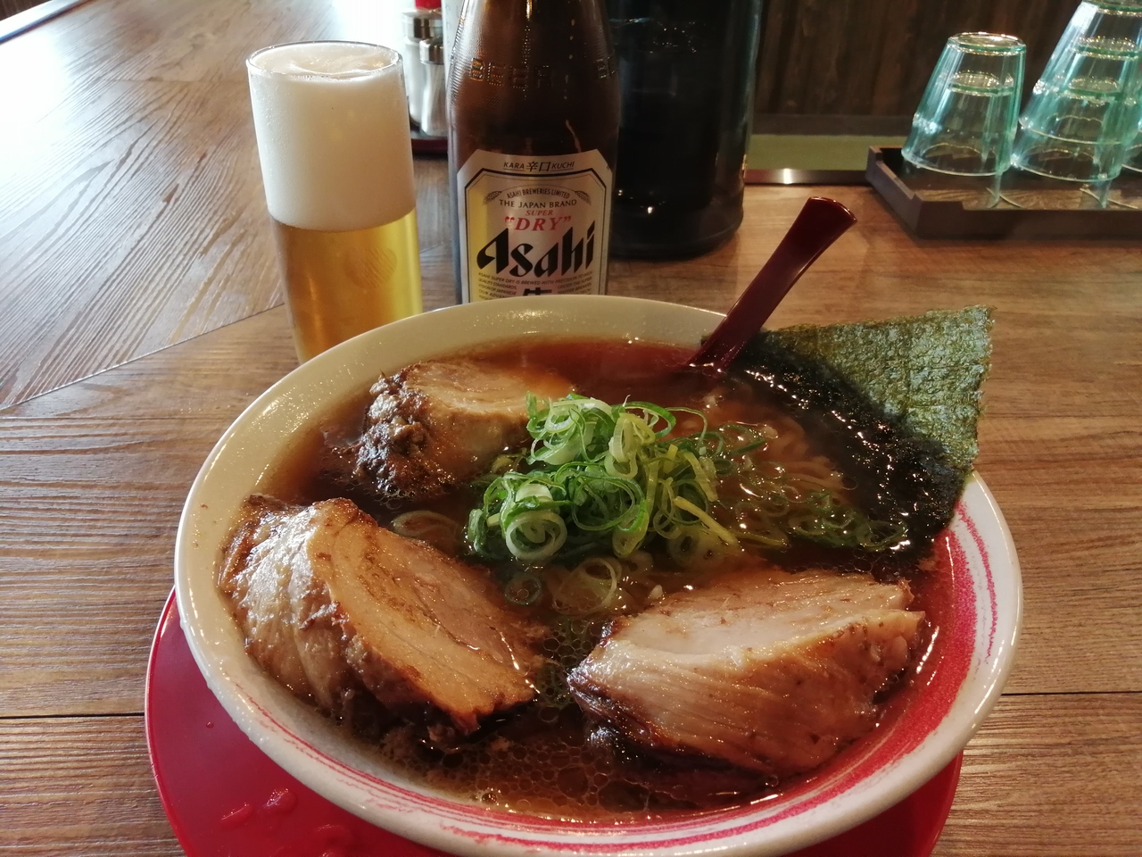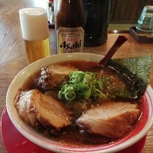 ごっついチャーシューがウリのラーメン店です。「アゴダシ中華そば」(850円)の食券を買い、着席。まず運ばれてきたのはビール(チャーシューで一杯やりたかったんでこちらの食券も合わせて購入しときました)。スーパードライの中瓶(500円)。