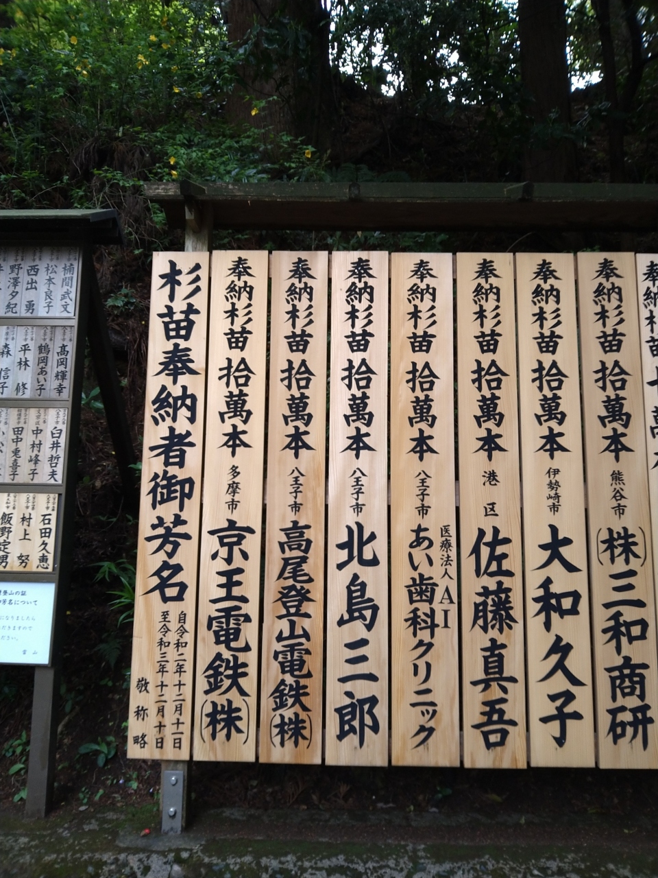 山門をくぐり1号路の脇には「杉苗奉納の芳名板」がずらりと並んでいます。1千本~10万本まで、芳名板もだんだん名前の文字も大きくなっていて、知っている人の名前を探したり、会社名をみつけたりと意外と面白かったです。昔は本当の杉苗木を納めたそうですが、現在はお金だそう。本殿に近い場所に北島三郎さんのお名前を見つけてびっくり。八王子市にお住まいの御縁なのですね。地元の方たちに大切にされている薬王院なのだと思いました。