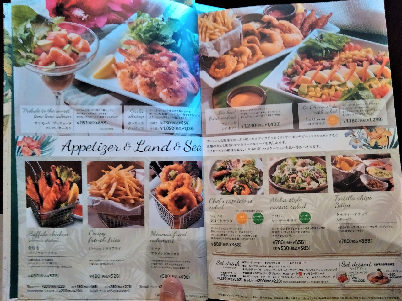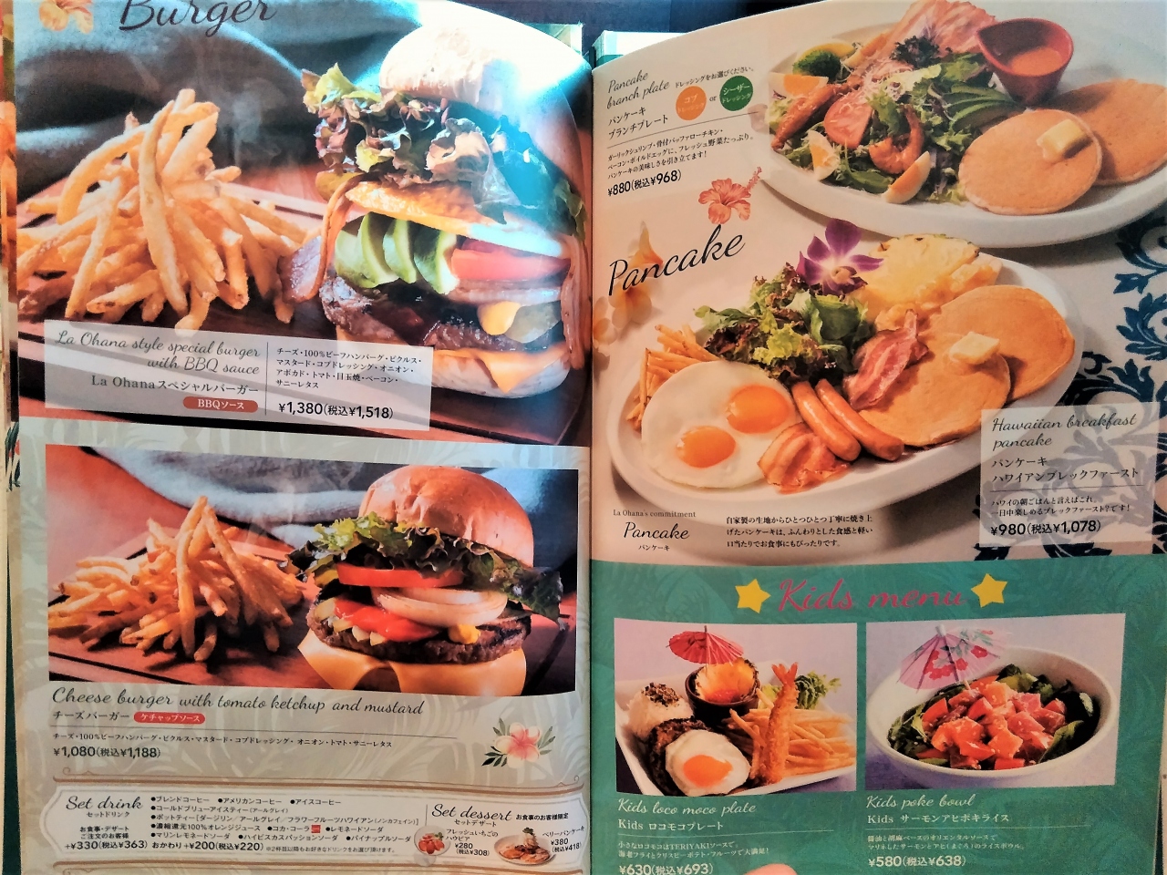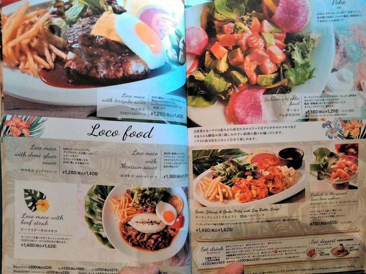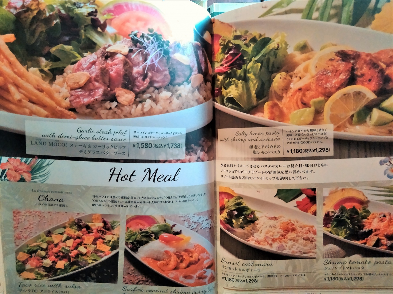 ハワイアンのメニューが並んでいて、ロコモコ、パンケーキ、ステーキ、ハンバーガー、タコライスなどがあります。